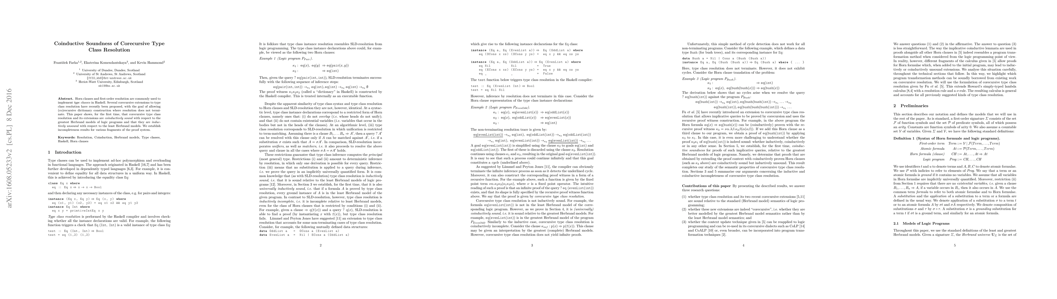 Horn clauses and first-order resolution are commonly used to implement type classes in Haskell. Several corecursive extensions to type class resolution have recently been proposed, with the goal of allowing (co)recursive dictionary construction where resolution does not termi- nate. This paper shows, for the first time, that corecursive type class resolution and its extensions are coinductively sound with respect to the greatest Herbrand models of logic programs and that they are induc- tively unsound with respect to the least Herbrand models. We establish incompleteness results for various fragments of the proof system.