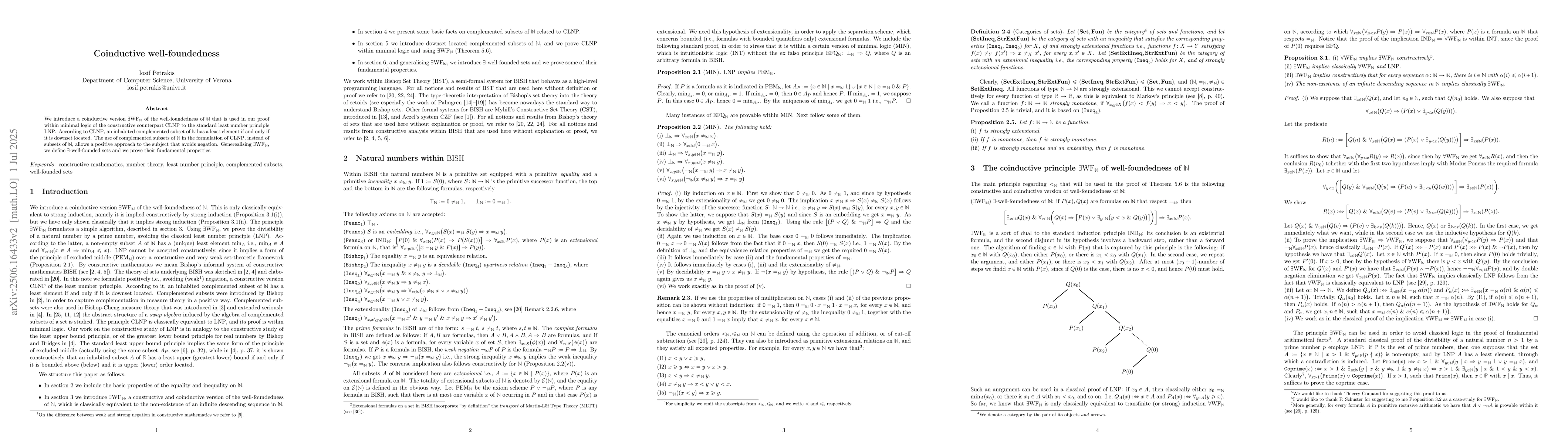 The paper introduces a coinductive version of well-foundedness for natural numbers (N) and extends it to general sets, defining $\exists$-well-founded sets. It uses complemented subsets of N in the formulation of the constructive least number principle (CLNP), avoiding negation.