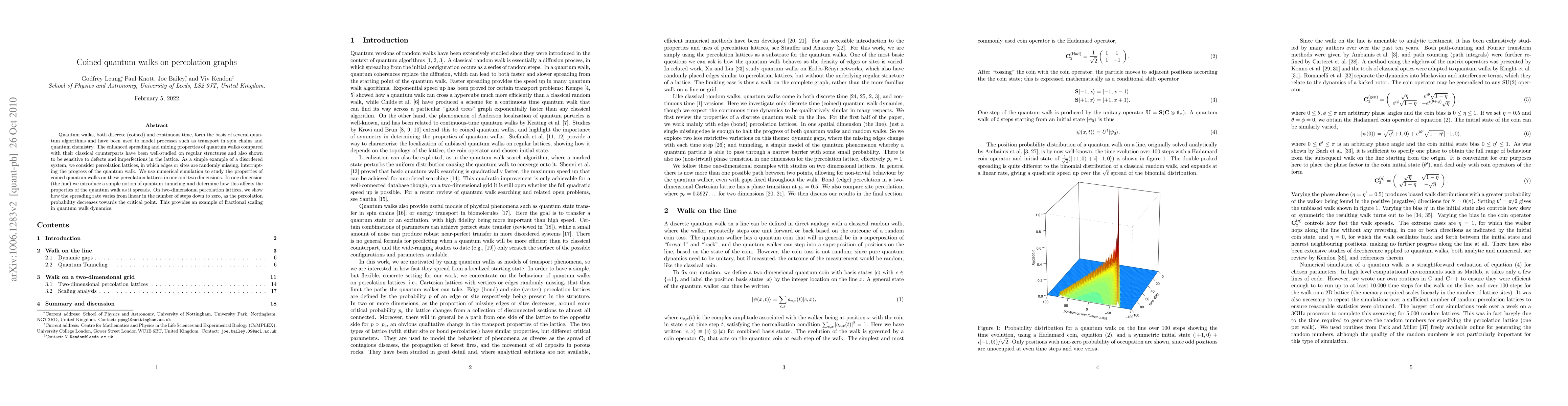 The paper explores the dynamics of coined quantum walks on percolation graphs, showing how the random removal of edges or sites affects quantum walk spreading and mixing properties. In one dimension, quantum tunneling is introduced, while in two dimensions, the spreading rate exhibits fractional scaling from linear to zero as the percolation probability nears the critical point.