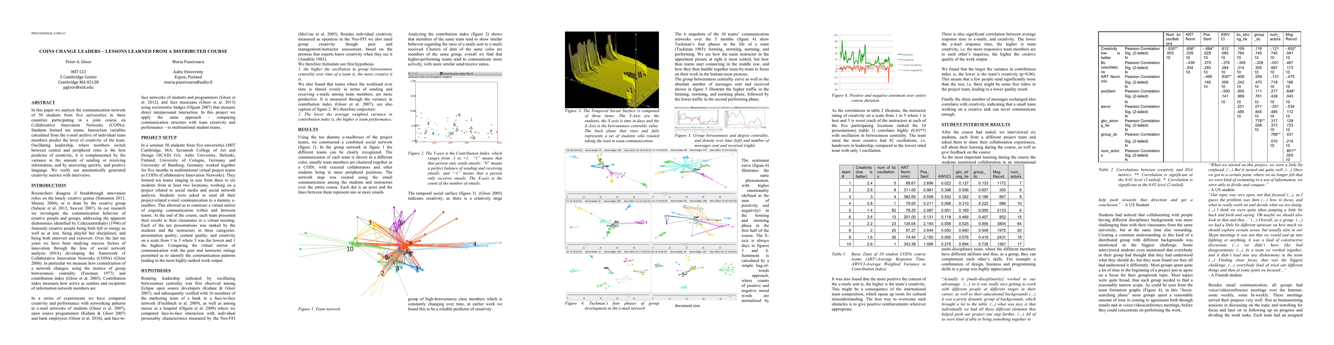 In this paper we analyze the communication network of 50 students from five universities in three countries participating in a joint course on Collaborative Innovation Networks (COINs). Students formed ten teams. Interaction variables calculated from the e-mail archive of individual team members predict the level of creativity of the team. Oscillating leadership, where members switch between central and peripheral roles is the best predictor of creativity, it is complemented by the variance in the amount of sending or receiving information, and by answering quickly, and positive language. We verify our automatically generated creativity metrics with interviews.