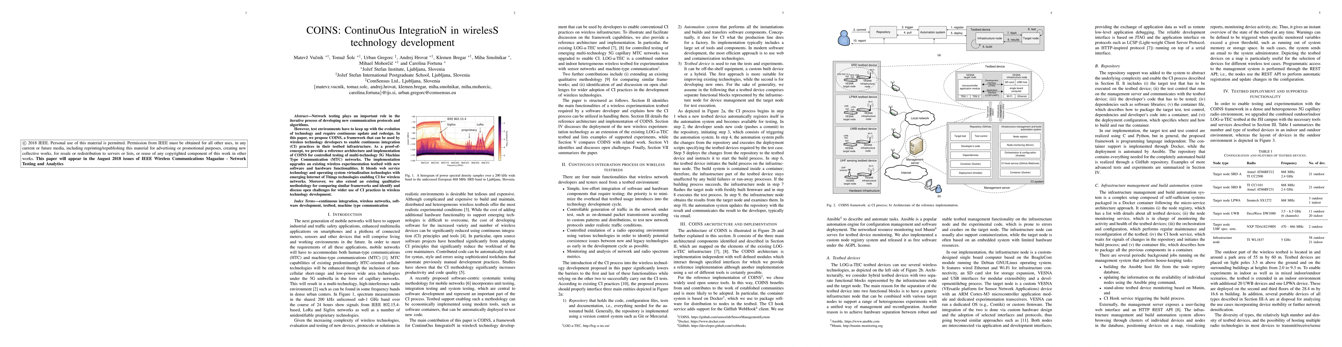 This paper introduces COINS, a framework for continuous integration in wireless technology development, aimed at enabling iterative testing of communication protocols. It presents a reference architecture for testing 5G Machine Type Communication networks, blending web services, virtualization, and IoT technologies, and discusses challenges for broader adoption of CI practices.