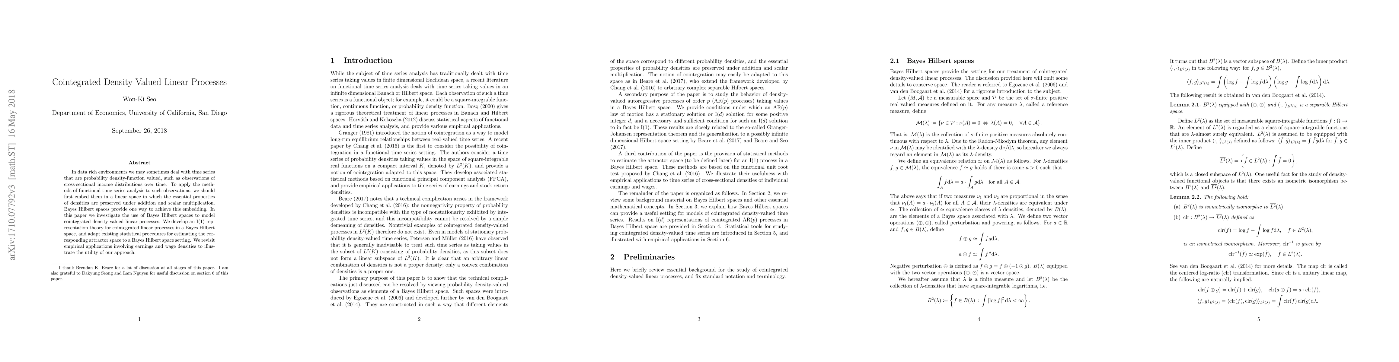 In data rich environments we may sometimes deal with time series that are probability density-function valued, such as observations of cross-sectional income distributions over time. To apply the methods of functional time series analysis to such observations, we should first embed them in a linear space in which the essential properties of densities are preserved under addition and scalar multiplication. Bayes Hilbert spaces provide one way to achieve this embedding. In this paper we investigate the use of Bayes Hilbert spaces to model cointegrated density-valued linear processes. We develop an I(1) representation theory for cointegrated linear processes in a Bayes Hilbert space, and adapt existing statistical procedures for estimating the corresponding attractor space to a Bayes Hilbert space setting. We revisit empirical applications involving earnings and wage densities to illustrate the utility of our approach.