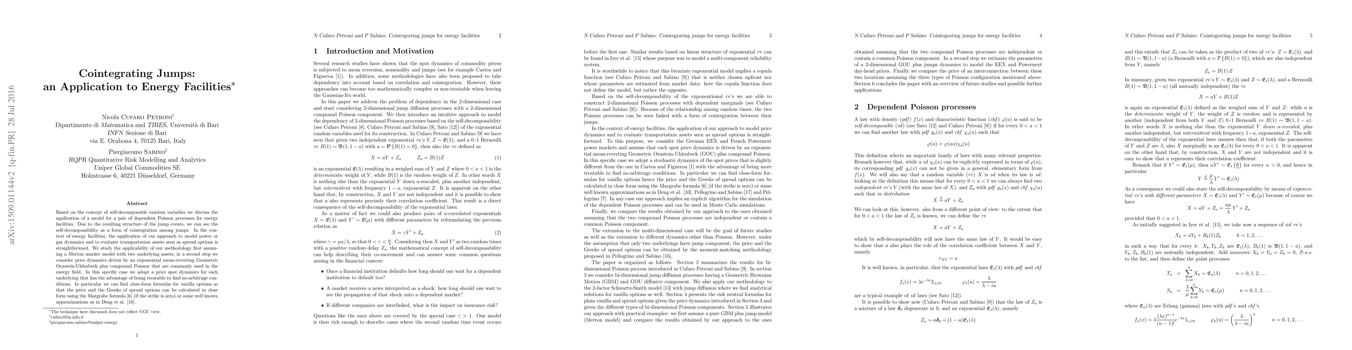 Based on the concept of self-decomposable random variables we discuss the application of a model for a pair of dependent Poisson processes to energy facilities. Due to the resulting structure of the jump events we can see the self-decomposability as a form of cointegration among jumps. In the context of energy facilities, the application of our approach to model power or gas dynamics and to evaluate transportation assets seen as spread options is straightforward. We study the applicability of our methodology first assuming a Merton market model with two underlying assets; in a second step we consider price dynamics driven by an exponential mean-reverting Geometric Ornstein-Uhlenbeck plus compound Poisson that are commonly used in the energy field. In this specific case we propose a price spot dynamics for each underlying that has the advantage of being treatable to find non-arbitrage conditions. In particular we can find close-form formulas for vanilla options so that the price and the Greeks of spread options can be calculated in close form using the Margrabe formula (if the strike is zero) or some other well known approximation.