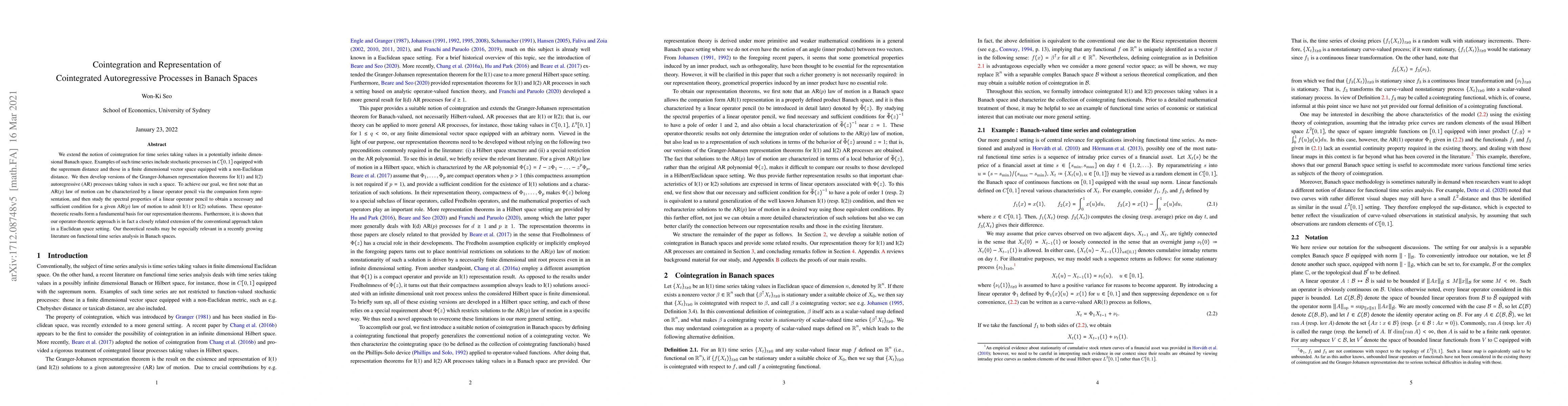 We extend the notion of cointegration for time series taking values in a potentially infinite dimensional Banach space. Examples of such time series include stochastic processes in C[0,1] equipped with the supremum distance and those in a finite dimensional vector space equipped with a non-Euclidean distance. We then develop versions of the Granger-Johansen representation theorems for I(1) and I(2) autoregressive (AR) processes taking values in such a space. To achieve our goal, we first note that an AR(p) law of motion can be characterized by a linear operator pencil via the companion form representation, and then study the spectral properties of a linear operator pencil to obtain a necessary and sufficient condition for a given AR(p) law of motion to admit I(1) or I(2) solutions. These operator-theoretic results form a fundamental basis for our representation theorems. Furthermore, it is shown that our operator-theoretic approach is in fact a closely related extension of the conventional approach taken in a Euclidean space setting. Our theoretical results may be especially relevant in a recently growing literature on functional time series analysis in Banach spaces.