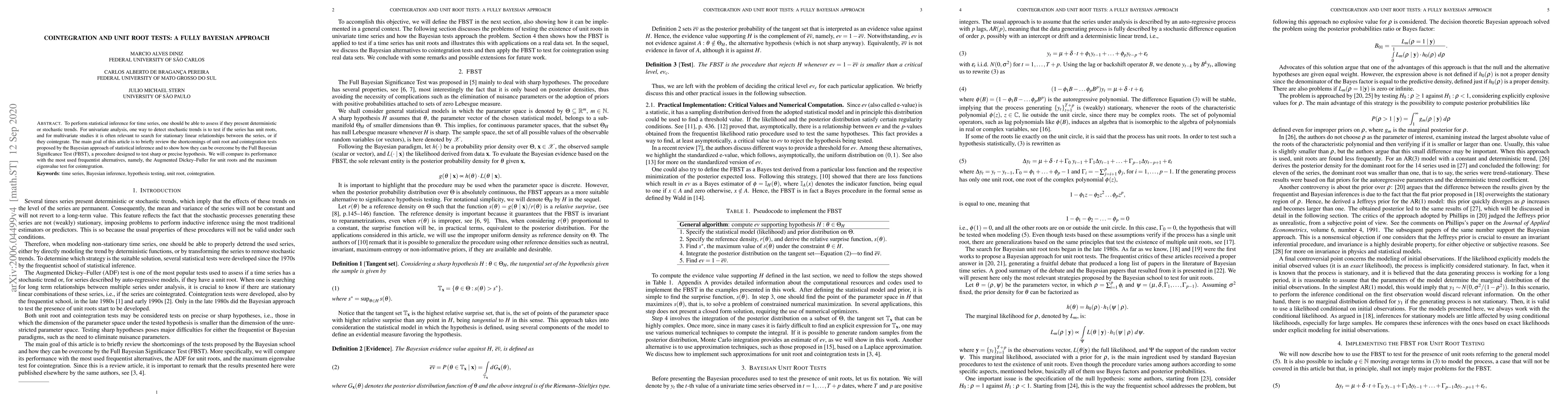 The paper proposes a fully Bayesian approach for cointegration and unit root tests, overcoming shortcomings of previous Bayesian methods by employing the Fully Bayesian Significance Test (FBST). It compares the performance of FBST with frequentist alternatives such as the Augmented Dickey-Fuller test for unit roots and the maximum eigenvalue test for cointegration.