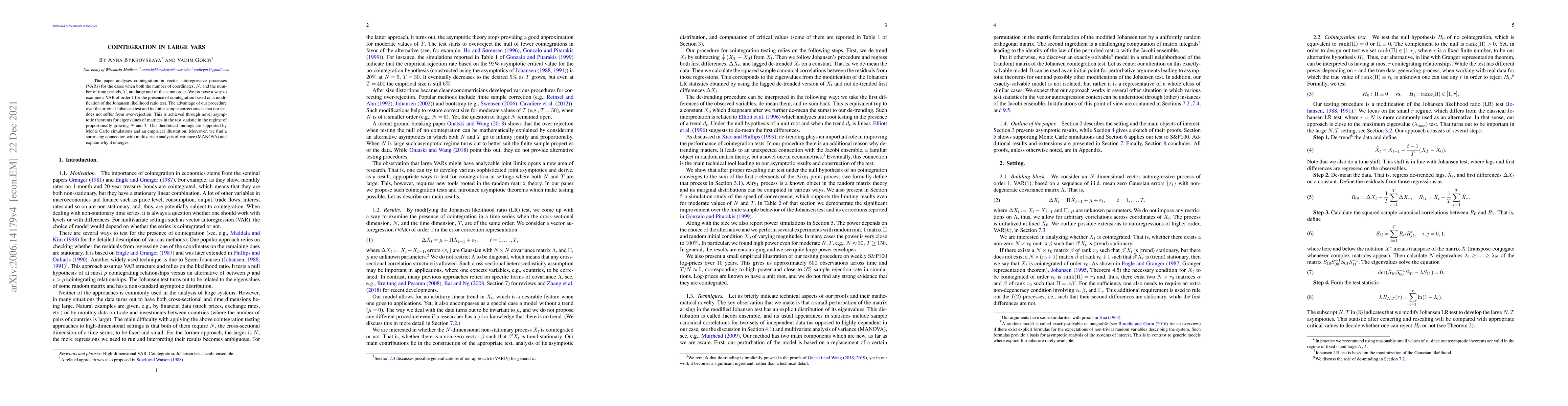 The paper analyses cointegration in vector autoregressive processes (VARs) for the cases when both the number of coordinates, $N$, and the number of time periods, $T$, are large and of the same order. We propose a way to examine a VAR of order $1$ for the presence of cointegration based on a modification of the Johansen likelihood ratio test. The advantage of our procedure over the original Johansen test and its finite sample corrections is that our test does not suffer from over-rejection. This is achieved through novel asymptotic theorems for eigenvalues of matrices in the test statistic in the regime of proportionally growing $N$ and $T$. Our theoretical findings are supported by Monte Carlo simulations and an empirical illustration. Moreover, we find a surprising connection with multivariate analysis of variance (MANOVA) and explain why it emerges.