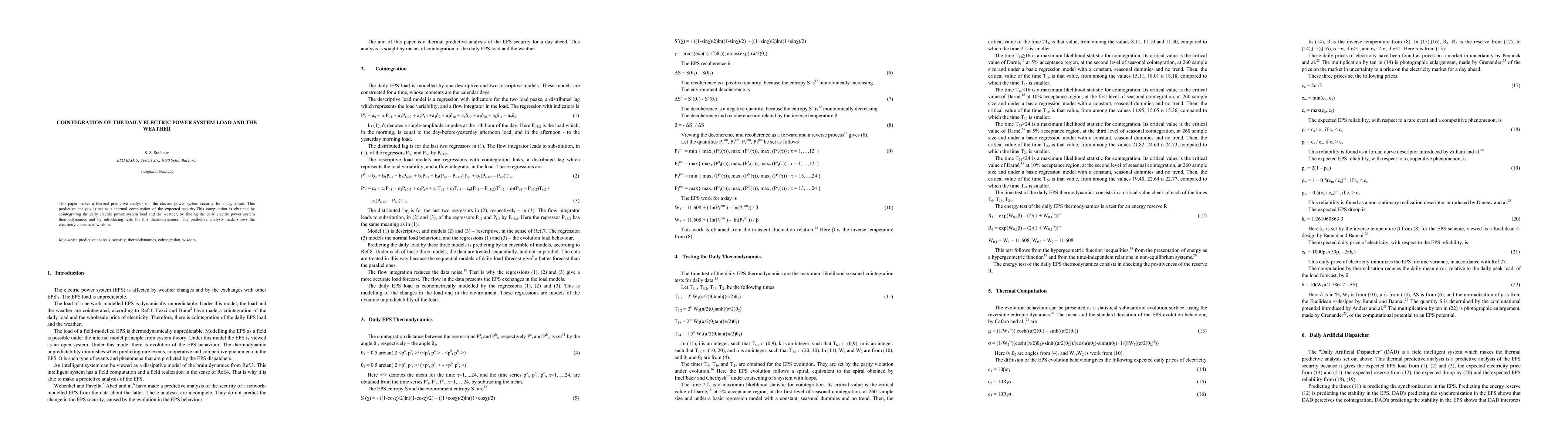 The paper makes a thermal predictive analysis of the electric power system security for a day ahead. This predictive analysis is set as a thermal computation of the expected security. This computation is obtained by cointegrating the daily electric power systen load and the weather, by finding the daily electric power system thermodynamics and by introducing tests for this thermodynamics. The predictive analysis made shows the electricity consumers' wisdom.