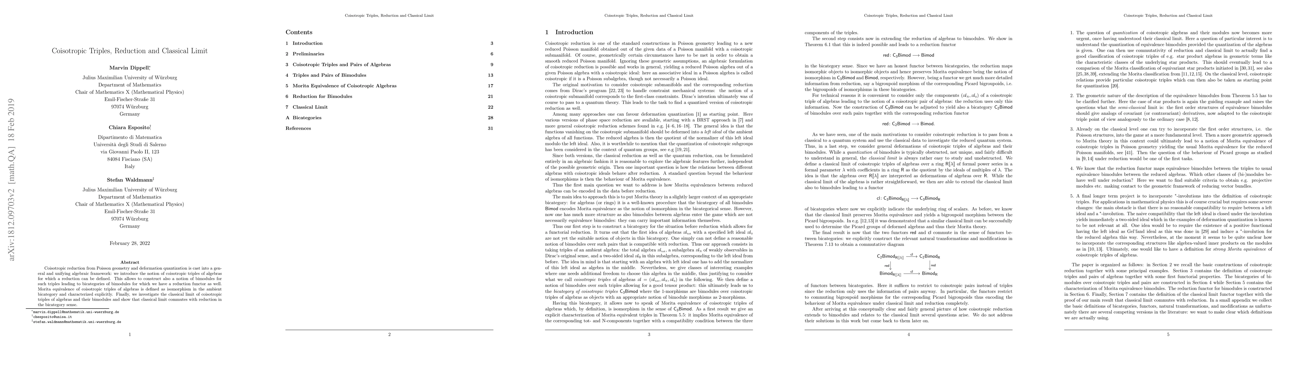 This paper introduces coisotropic triples of algebras within a unifying algebraic framework, establishing a reduction concept and constructing bimodules for these triples. It also defines Morita equivalence for such triples and shows that the classical limit commutes with reduction in the bicategory sense.