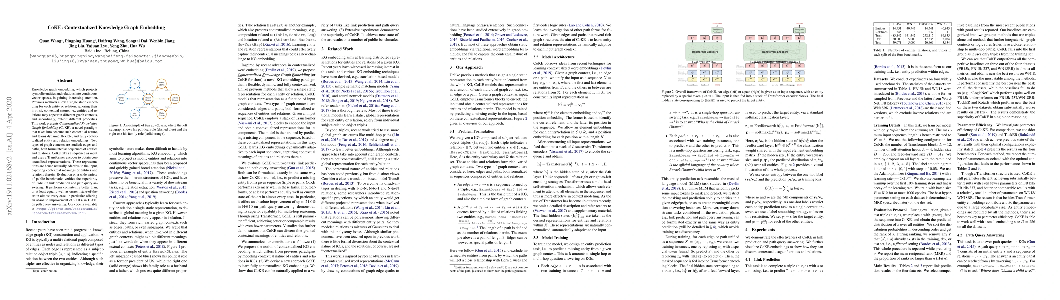 CoKE introduces a novel framework for contextualized knowledge graph embedding, leveraging Transformer encoders to dynamically adapt entity and relation embeddings based on graph contexts. It outperforms existing methods in link prediction and path query answering, especially achieving a 21.0% improvement in H@10 for path query answering.