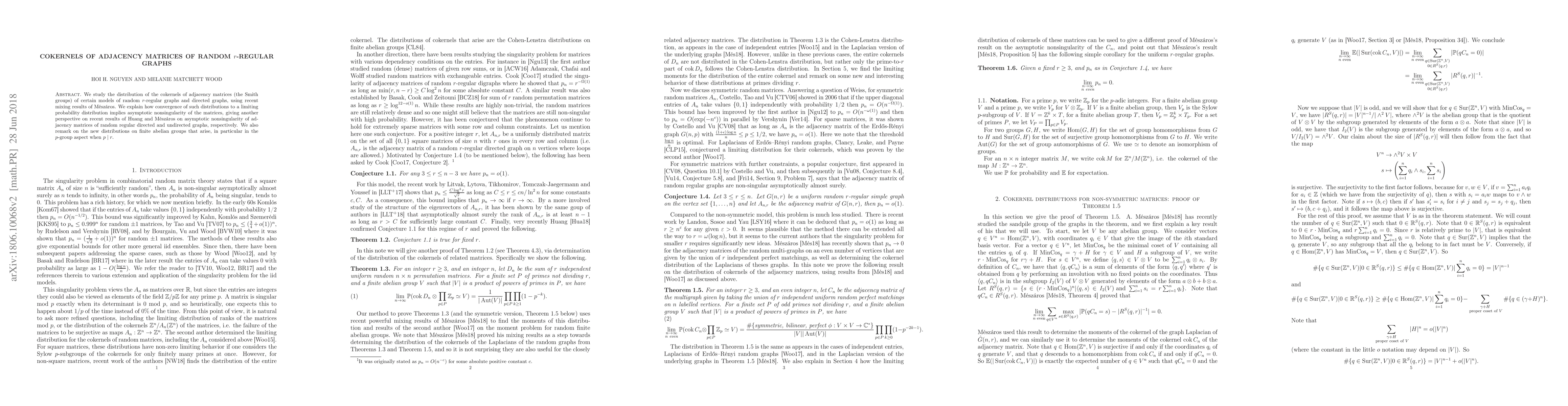 This paper investigates the distribution of cokernels of adjacency matrices of random $r$-regular graphs and directed graphs, linking their convergence to a limiting probability distribution with the asymptotic nonsingularity of these matrices. It also highlights new distributions on finite abelian groups, especially when $p$ divides $r$.