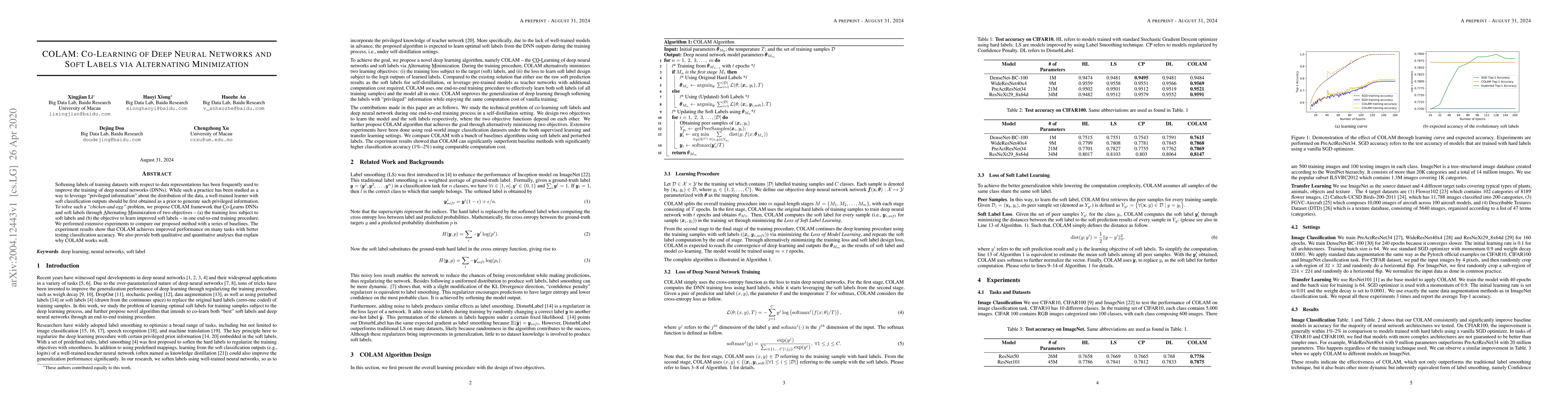Softening labels of training datasets with respect to data representations has been frequently used to improve the training of deep neural networks (DNNs). While such a practice has been studied as a way to leverage privileged information about the distribution of the data, a well-trained learner with soft classification outputs should be first obtained as a prior to generate such privileged information. To solve such chicken-egg problem, we propose COLAM framework that Co-Learns DNNs and soft labels through Alternating Minimization of two objectives - (a) the training loss subject to soft labels and (b) the objective to learn improved soft labels - in one end-to-end training procedure. We performed extensive experiments to compare our proposed method with a series of baselines. The experiment results show that COLAM achieves improved performance on many tasks with better testing classification accuracy. We also provide both qualitative and quantitative analyses that explain why COLAM works well.