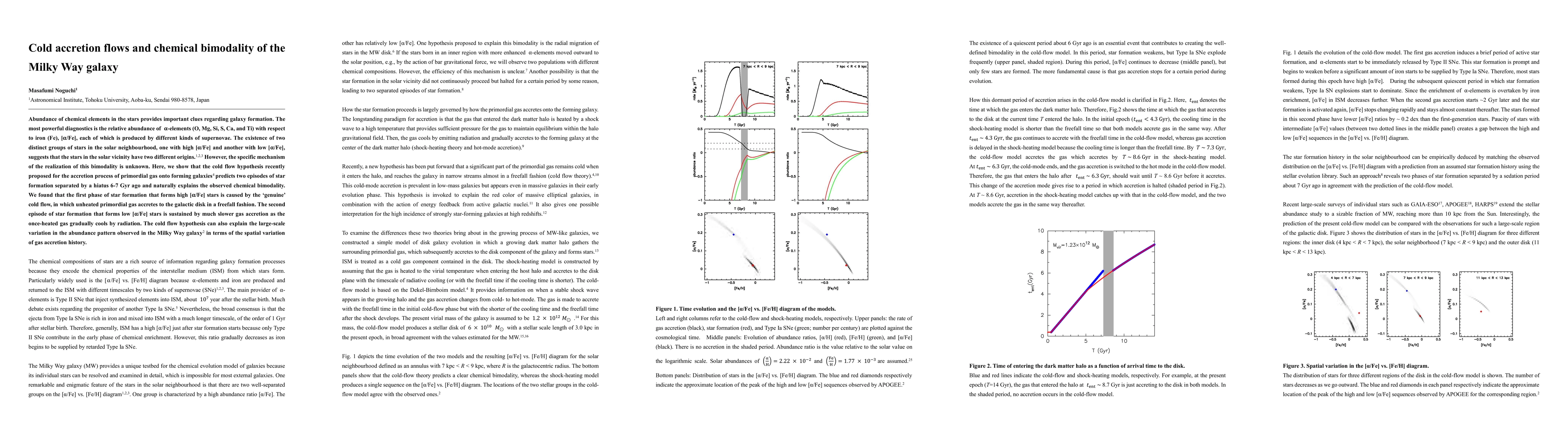 The cold accretion hypothesis explains the Milky Way galaxy's chemical bimodality as two episodes of star formation separated by a 6-7 Gyr hiatus, with different mechanisms for high and low [{ heta}/Fe] stars.