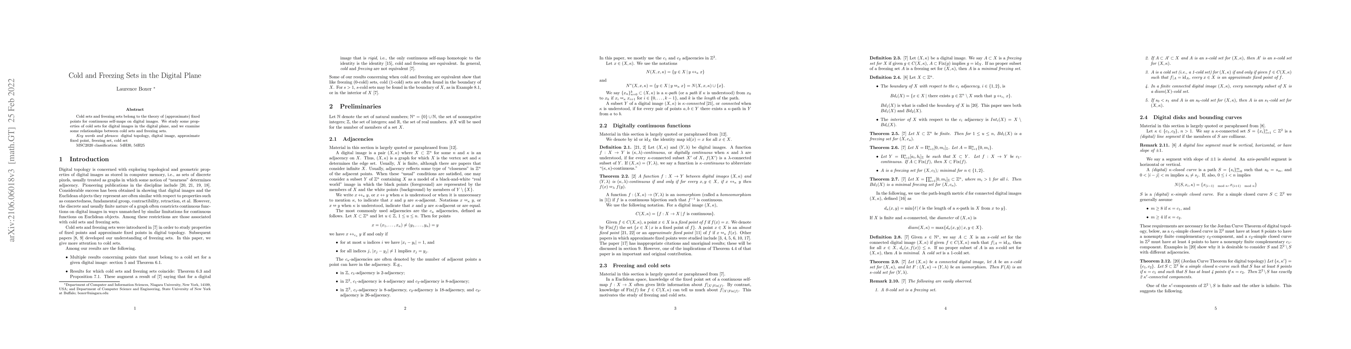 Cold sets and freezing sets belong to the theory of (approximate) fixed points for continuous self-maps on digital images. We study some properties of cold sets for digital images in the digital plane, and we examine some relationships between cold sets and freezing sets.
