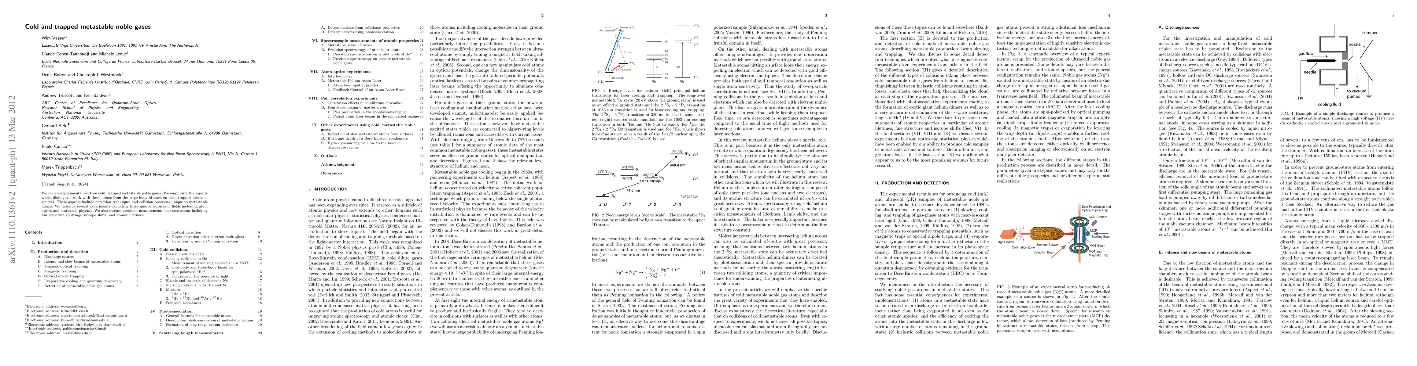 This paper reviews experimental and theoretical studies on cold, trapped metastable noble gases, highlighting unique detection techniques and collision processes. It discusses applications in atom optics and statistical physics, along with precision measurements on fine structure splittings, isotope shifts, and atomic lifetimes.
