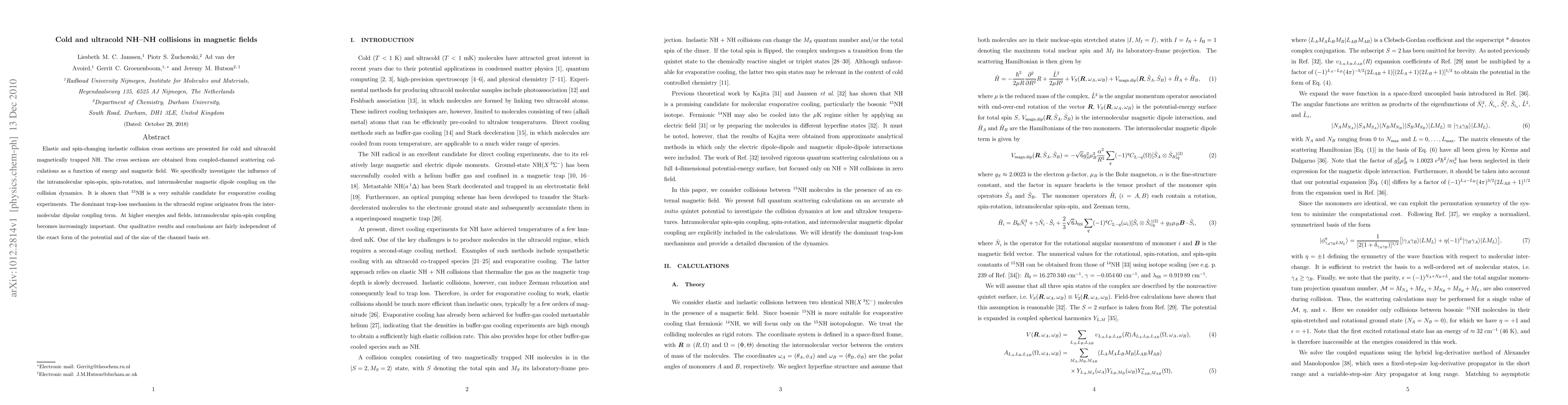 Elastic and spin-changing inelastic collision cross sections are presented for cold and ultracold magnetically trapped NH. The cross sections are obtained from coupled-channel scattering calculations as a function of energy and magnetic field. We specifically investigate the influence of the intramolecular spin-spin, spin-rotation, and intermolecular magnetic dipole coupling on the collision dynamics. It is shown that $^{15}$NH is a very suitable candidate for evaporative cooling experiments. The dominant trap-loss mechanism in the ultracold regime originates from the intermolecular dipolar coupling term. At higher energies and fields, intramolecular spin-spin coupling becomes increasingly important. Our qualitative results and conclusions are fairly independent of the exact form of the potential and of the size of the channel basis set.