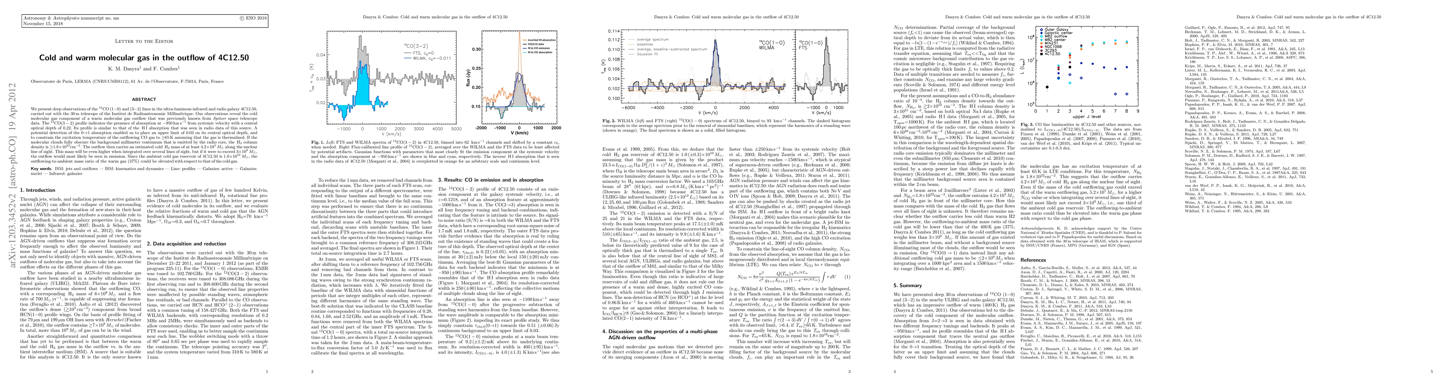 We present deep observations of the 12CO(1-0) and (3-2) lines in the ultra-luminous infrared and radio galaxy 4C12.50, carried out with the 30m telescope of the Institut de Radioastronomie Millimetrique. Our observations reveal the cold molecular gas component of a warm molecular gas outflow that was previously known from Spitzer Space Telescope data. The 12CO(3-2) profile indicates the presence of absorption at -950 km/s from systemic velocity with a central optical depth of 0.22. Its profile is similar to that of the HI absorption that was seen in radio data of this source. A potential detection of the (0-1) absorption enabled us to place an upper limit of 0.03 on its central optical depth, and to constrain the excitation temperature of the outflowing CO gas to >=65K assuming that the gas is thermalized. If the molecular clouds fully obscure the background millimeter continuum that is emitted by the radio core, the H2 column density is >=1.8*10^22 /cm^2. The outflow then carries an estimated cold H2 mass of at least 4.2*10^3 M_sun along the nuclear line of sight. This mass will be even higher when integrated over several lines of sight, but if it were to exceed 3*10^9 M_sun, the outflow would most likely be seen in emission. Since the ambient cold gas reservoir of 4C12.50 is 1.0*10^10 M_sun, the outflowing-to-ambient mass ratio of the warm gas (37%) could be elevated with respect to that of the cold gas.