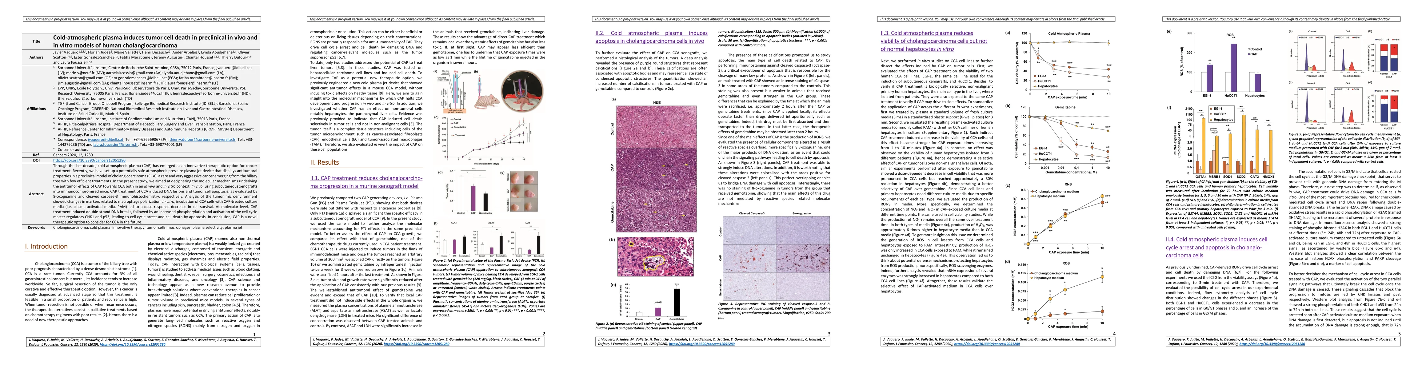 Cold atmospheric plasma (CAP) induces tumor cell death in human cholangiocarcinoma (CCA) models through DNA damage and apoptosis, both in vivo and in vitro, highlighting its potential as a novel cancer treatment. The study reveals CAP-induced cell cycle arrest and macrophage polarization changes, suggesting a multifaceted antitumor mechanism.