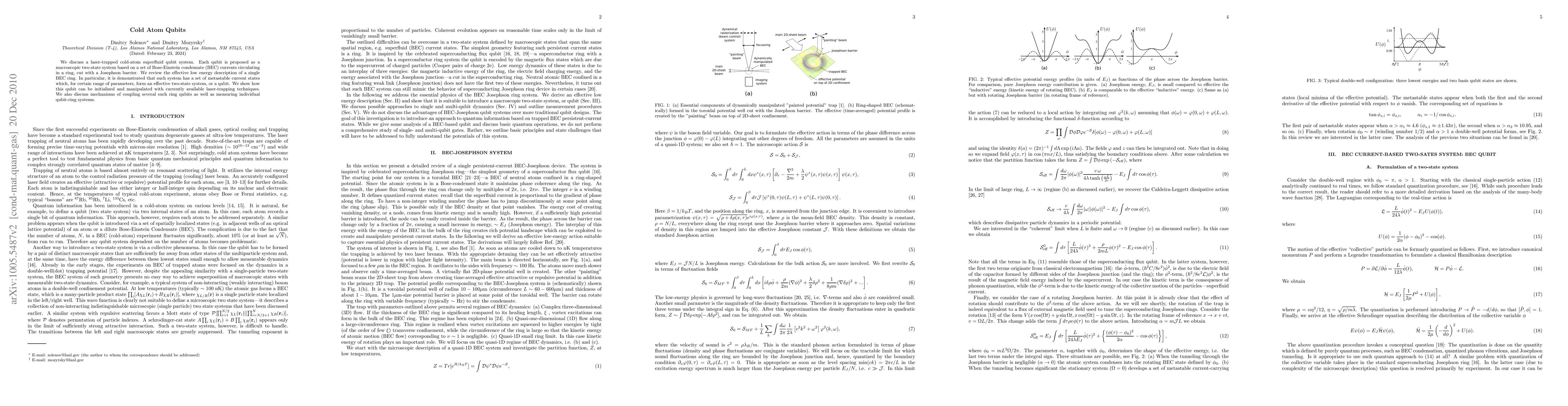 We discuss a laser-trapped cold-atom superfluid qubit system. Each qubit is proposed as a macroscopic two-state system based on a set of Bose-Einstein condensate (BEC) currents circulating in a ring, cut with a Josephson barrier. We review the effective low energy description of a single BEC ring. In particular, it is demonstrated that such system has a set of metastable current states which, for certain range of parameters, form an effective two-state system, or a qubit. We show how this qubit can be initialized and manipulated with currently available laser-trapping techniques. We also discuss mechanisms of coupling several such ring qubits as well as measuring individual qubit-ring systems.