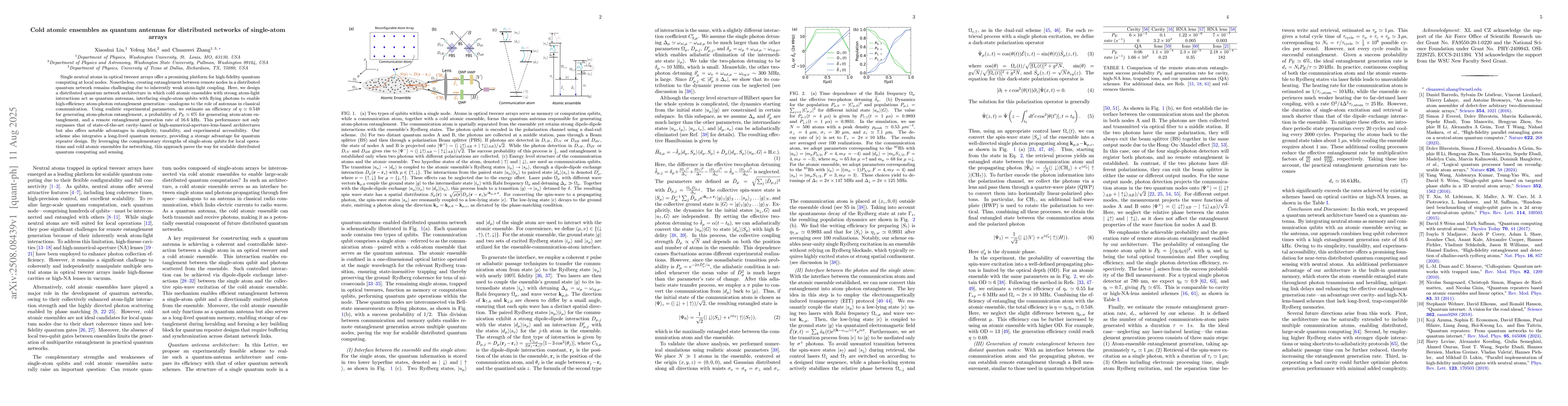 Single neutral atoms in optical tweezer arrays offer a promising platform for high-fidelity quantum computing at local nodes. Nonetheless, creating entanglement between remote nodes in a distributed quantum network remains challenging due to inherently weak atom-light coupling. Here, we design a distributed quantum network architecture in which cold atomic ensembles with strong atom-light interactions act as quantum antennas, interfacing single-atom qubits with flying photons to enable high-efficiency atom-photon entanglement generation -- analogous to the role of antennas in classical communication. Using realistic experimental parameters, we estimate an efficiency of $\eta \simeq 0.548$ for generating atom-photon entanglement, a probability of $P_{E} \simeq 6 \%$ for generating atom-atom entanglement, and a remote entanglement generation rate of $16.6 $ kHz. This performance not only surpasses that of state-of-the-art cavity-based or high-numerical-aperture-lens-based architectures but also offers notable advantages in simplicity, tunability, and experimental accessibility. Our scheme also integrates a long-lived quantum memory, providing a storage advantage for quantum repeater design. By leveraging the complementary strengths of single-atom qubits for local operations and cold atomic ensembles for networking, this approach paves the way for scalable distributed quantum computing and sensing.