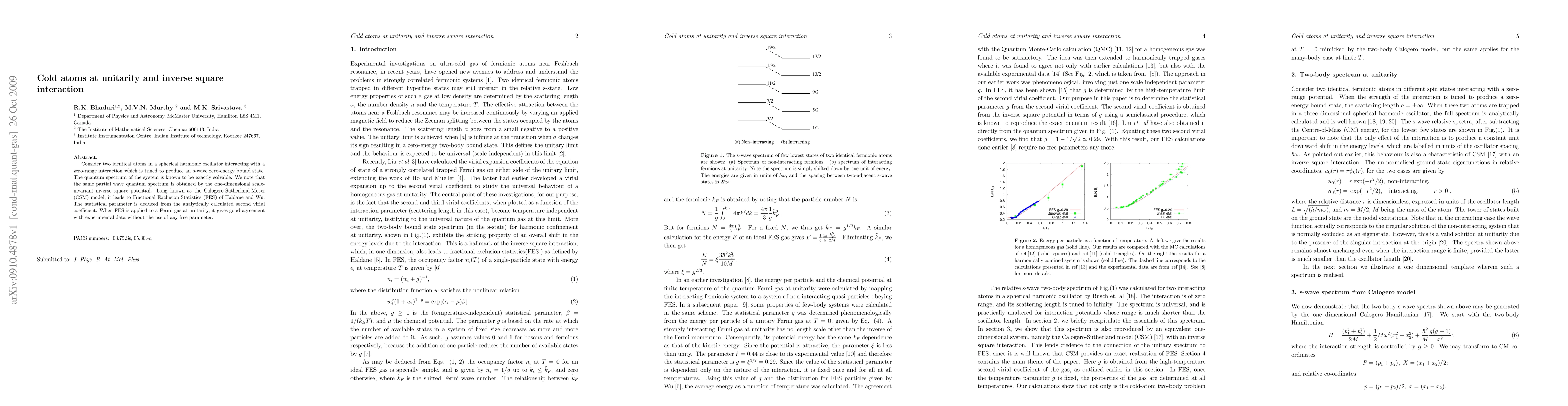This paper explores the quantum dynamics of cold atoms in a harmonic trap with a zero-range interaction tuned to unitarity, revealing an exact solvability linked to the Calogero-Sutherland-Moser model. The study demonstrates that Fractional Exclusion Statistics derived from the second virial coefficient accurately describes Fermi gas behavior without free parameters.