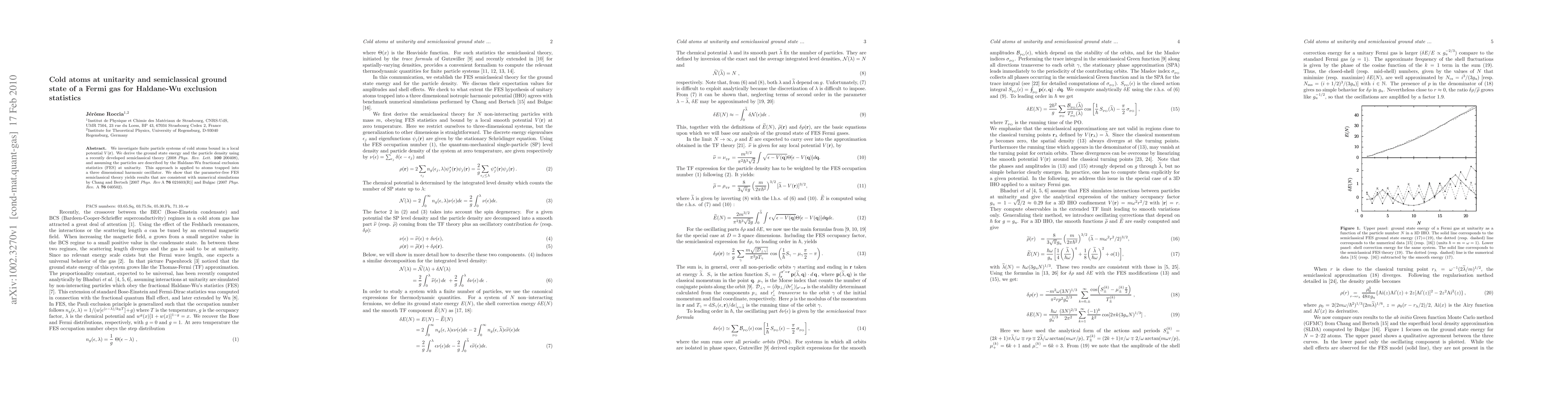 This paper investigates the ground state energy and particle density for cold atoms bound in a potential, using a semiclassical theory and Haldane-Wu fractional exclusion statistics at unitarity. The results from the parameter-free theory align with numerical simulations, demonstrating its validity.