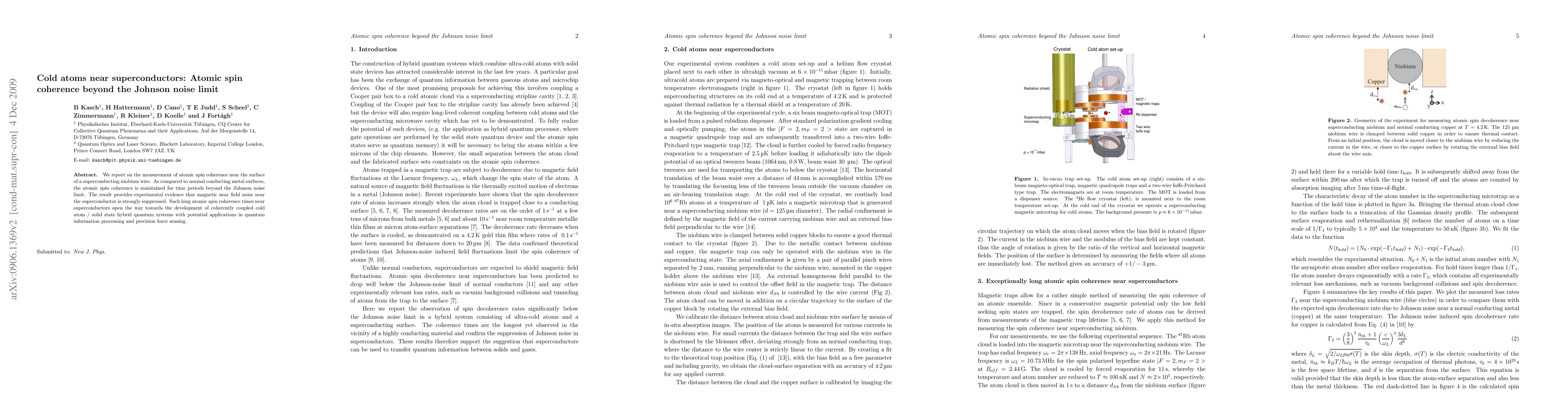 This research demonstrates that atomic spin coherence near superconducting niobium wire exceeds the Johnson noise limit, indicating significant suppression of magnetic near field noise. The findings pave the way for advanced hybrid quantum systems combining cold atoms and solid-state materials for quantum information and precision sensing applications.