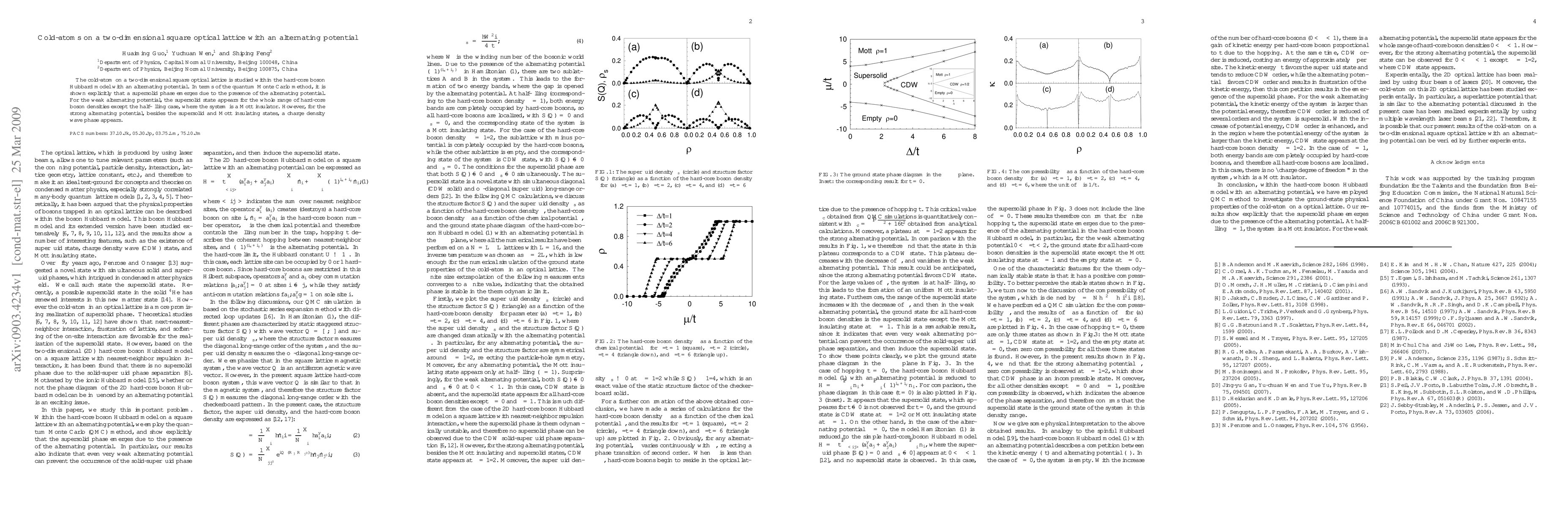 This paper explores cold-atom behavior on a two-dimensional square optical lattice with an alternating potential, revealing a supersolid phase via quantum Monte Carlo simulations. For weak potentials, the supersolid phase exists except at half-filling, while strong potentials additionally induce a charge density wave phase.