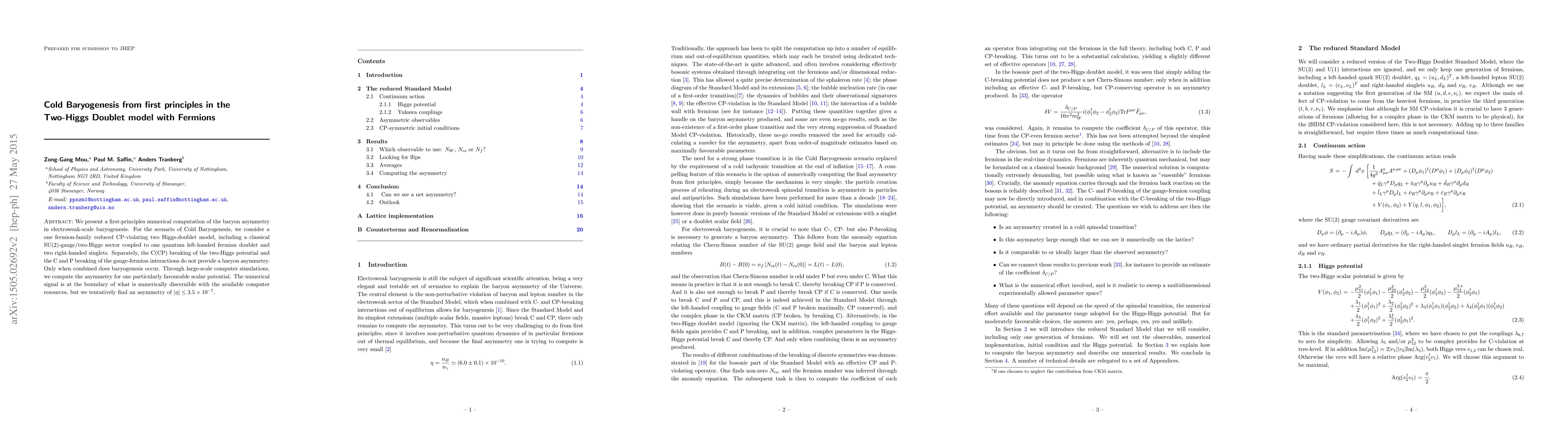 We present a first-principles numerical computation of the baryon asymmetry in electroweak-scale baryogenesis. For the scenario of Cold Baryogenesis, we consider a one fermion-family reduced CP-violating two Higgs-doublet model, including a classical SU(2)-gauge/two-Higgs sector coupled to one quantum left-handed fermion doublet and two right-handed singlets. Separately, the C(CP) breaking of the two-Higgs potential and the C and P breaking of the gauge-fermion interactions do not provide a baryon asymmetry. Only when combined does baryogenesis occur. Through large-scale computer simulations, we compute the asymmetry for one particularly favourable scalar potential. The numerical signal is at the boundary of what is numerically discernible with the available computer resources, but we tentatively find an asymmetry of $|\eta|\leq 3.5\times 10^{-7}$.