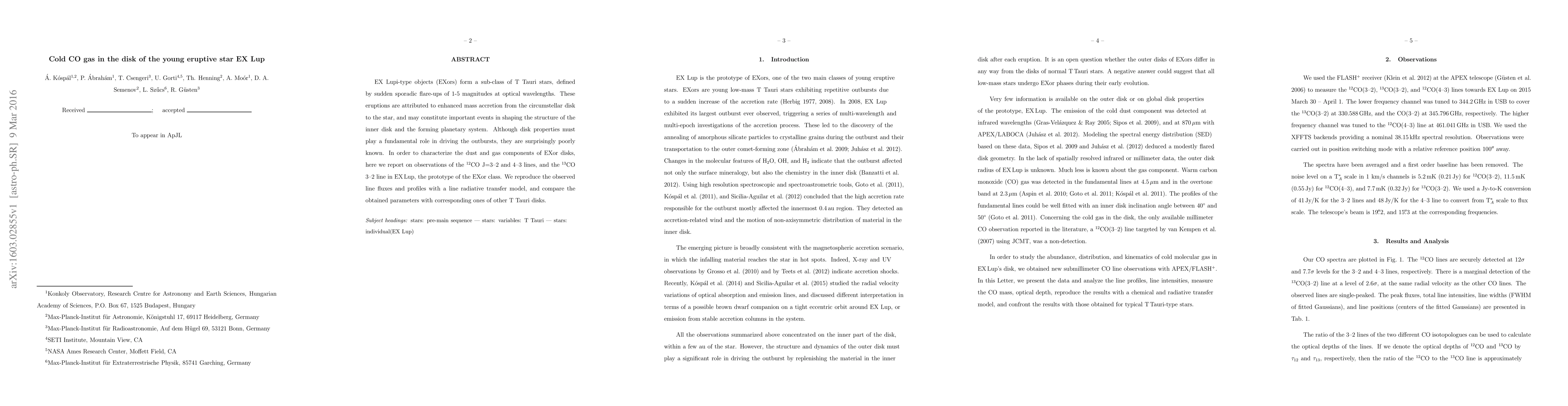 This study investigates the cold CO gas in the disk of the young eruptive star EX Lup, a prototype EXor, using observations of CO lines to characterize the disk's dust and gas components. The findings suggest that these properties play a crucial role in the star's sporadic flares, providing insights into the dynamics of T Tauri disks.