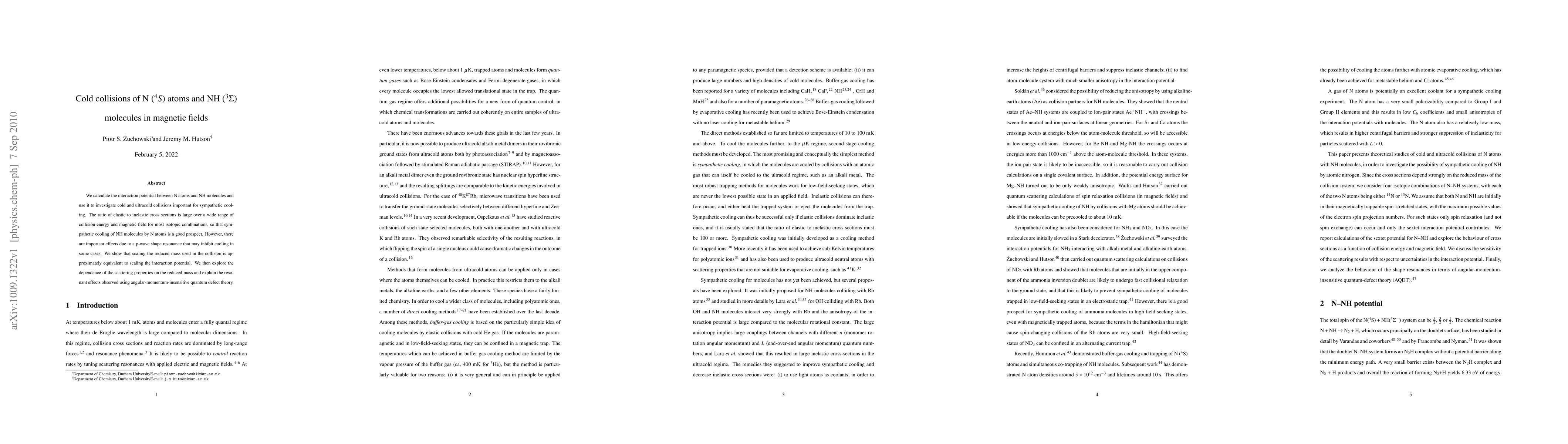 This paper investigates the interaction potential between N atoms and NH molecules, focusing on cold collisions relevant for sympathetic cooling. It finds that sympathetic cooling is promising due to a high ratio of elastic to inelastic cross sections, but p-wave shape resonances may hinder cooling. The study also demonstrates that scaling the reduced mass is nearly equivalent to scaling the interaction potential, and uses quantum defect theory to explain observed resonant effects.