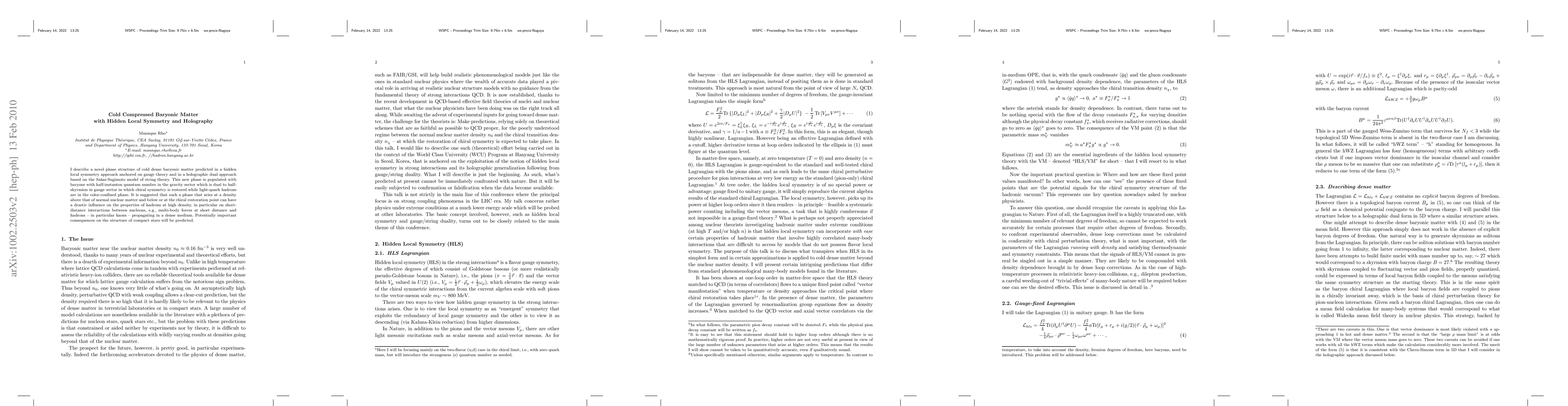 I describe a novel phase structure of cold dense baryonic matter predicted in a hidden local symmetry approach anchored on gauge theory and in a holographic dual approach based on the Sakai-Sugimoto model of string theory. This new phase is populated with baryons with half-instanton quantum number in the gravity sector which is dual to half-skyrmion in gauge sector in which chiral symmetry is restored while light-quark hadrons are in the color-confined phase. It is suggested that such a phase that aries at a density above that of normal nuclear matter and below or at the chiral restoration point can have a drastic influence on the properties of hadrons at high density, in particular on short-distance interactions between nucleons, e.g., multi-body forces at short distance and hadrons -- in particular kaons -- propagating in a dense medium. Potentially important consequences on the structure of compact stars will be predicted.
