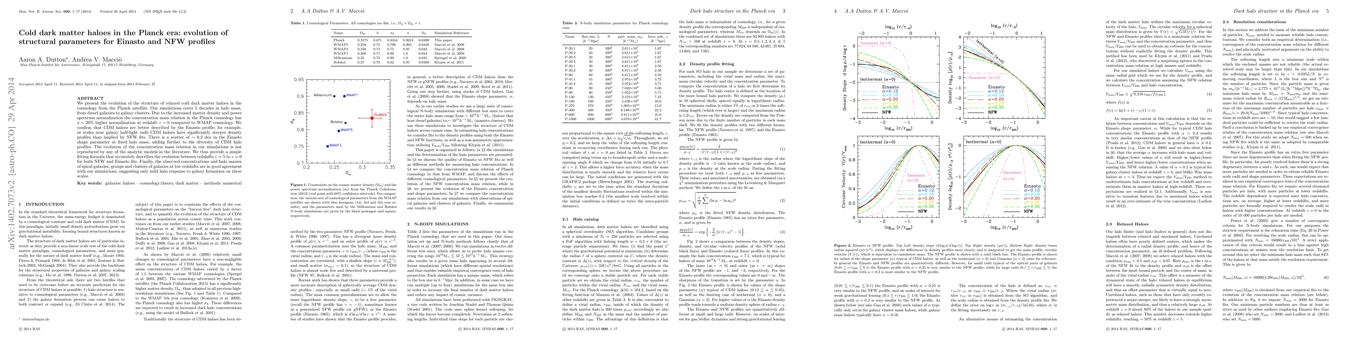 This paper investigates the evolution of cold dark matter halo structures in the Planck cosmology, finding that Einasto profiles better describe the halo density profiles than NFW profiles, especially near galaxy scales. The study provides a new fitting formula for the concentration-mass relation, showing good agreement with observed halo masses and concentrations of low-redshift galaxies.