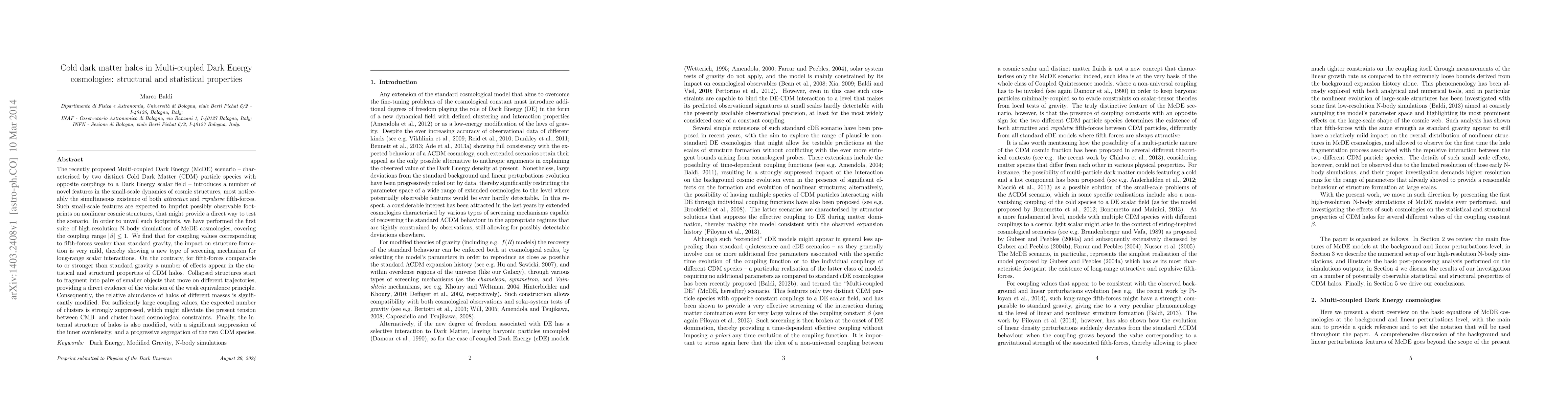 The research conducted high-resolution N-body simulations in Multi-coupled Dark Energy (McDE) cosmologies, revealing that mild fifth-forces lead to a novel screening mechanism for scalar interactions. For stronger fifth-forces, halos fragment, violating weak equivalence principle, altering halo mass abundance, and changing halo internal structure by suppressing inner overdensity and segregating CDM species. This could potentially resolve tension between CMB and cluster-based cosmological constraints.