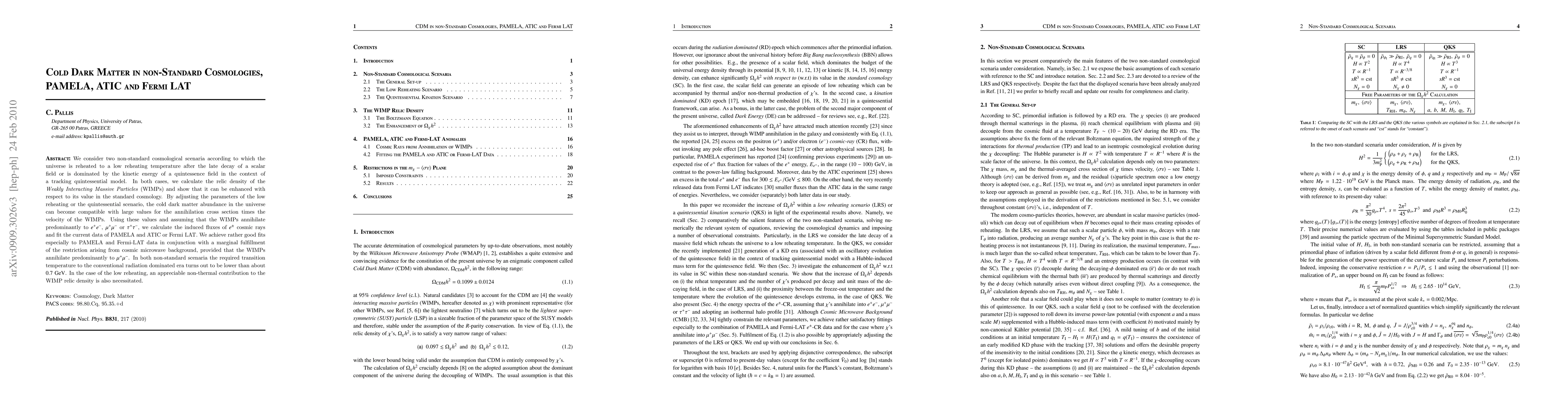 We consider two non-standard cosmological scenaria according to which the universe is reheated to a low reheating temperature after the late decay of a scalar field or is dominated by the kinetic energy of a quintessence field in the context of a tracking quintessential model. In both cases, we calculate the relic density of the \emph{Weakly Interacting Massive Particles} (WIMPs) and show that it can be enhanced with respect to its value in the standard cosmology. By adjusting the parameters of the low reheating or the quintessential scenario, the cold dark matter abundance in the universe can become compatible with large values for the annihilation cross section times the velocity of the WIMPs. Using these values and assuming that the WIMPs annihilate predominantly to $e^+e^-$, $\mu^+\mu^-$ or $\tau^+\tau^-$, we calculate the induced fluxes of $e^\pm$ cosmic rays and fit the current data of PAMELA and ATIC or Fermi LAT. We achieve rather good fits especially to PAMELA and Fermi-LAT data in conjunction with a marginal fulfillment of the restriction arising from cosmic microwave background, provided that the WIMPs annihilate predominantly to $\mu^+\mu^-$. In both non-standard scenaria the required transition temperature to the conventional radiation dominated era turns out to be lower than about $0.7 \GeV$. In the case of the low reheating, an appreciable non-thermal contribution to the WIMP relic density is also necessitated.