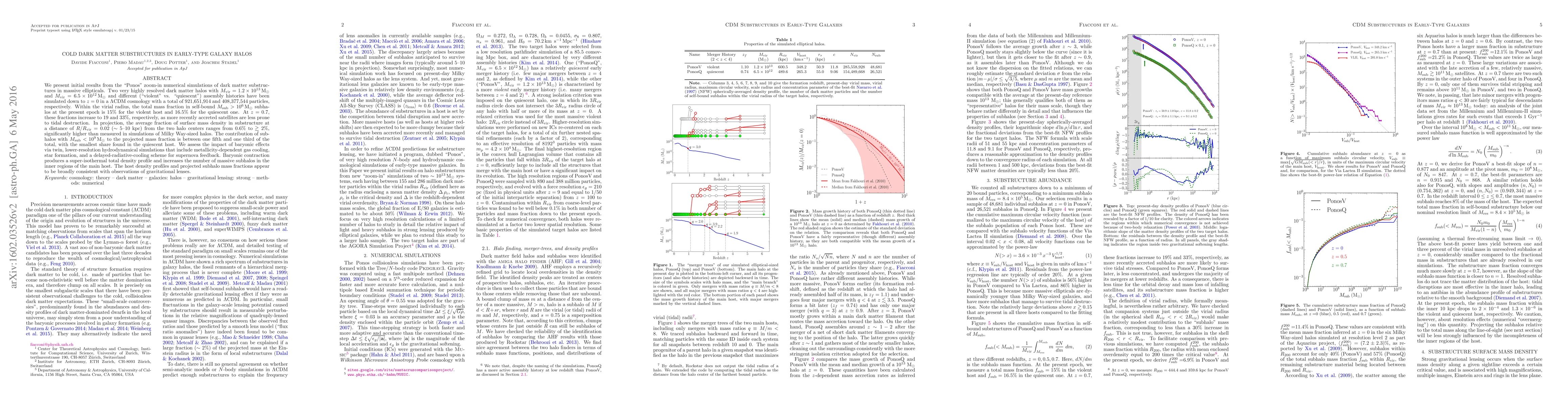 We present initial results from the "Ponos" zoom-in numerical simulations of dark matter substructures in massive ellipticals. Two very highly resolved dark matter halos with $M_{\rm vir}=1.2\times 10^{13}$ $M_{\odot}$ and $M_{\rm vir}=6.5\times 10^{12}$ $M_{\odot}$ and different ("violent" vs. "quiescent") assembly histories have been simulated down to $z=0$ in a $\Lambda$CDM cosmology with a total of 921,651,914 and 408,377,544 particles, respectively. Within the virial radius, the total mass fraction in self-bound $M_{\rm sub}>10^6$ $M_{\odot}$ subhalos at the present epoch is 15% for the violent host and 16.5% for the quiescent one. At $z=0.7$, these fractions increase to 19 and 33%, respectively, as more recently accreted satellites are less prone to tidal destruction. In projection, the average fraction of surface mass density in substructure at a distance of $R/R_{\rm vir}=0.02$ ($\sim 5-10$ kpc) from the two halo centers ranges from 0.6% to $\gtrsim 2$%, significantly higher than measured in simulations of Milky Way-sized halos. The contribution of subhalos with $M_{\rm sub} < 10^9$ $M_{\odot}$ to the projected mass fraction is between one fifth and one third of the total, with the smallest share found in the quiescent host. We assess the impact of baryonic effects via twin, lower-resolution hydrodynamical simulations that include metallicity-dependent gas cooling, star formation, and a delayed-radiative-cooling scheme for supernova feedback. Baryonic contraction produces a super-isothermal total density profile and increases the number of massive subhalos in the inner regions of the main host. The host density profiles and projected subhalo mass fractions appear to be broadly consistent with observations of gravitational lenses.