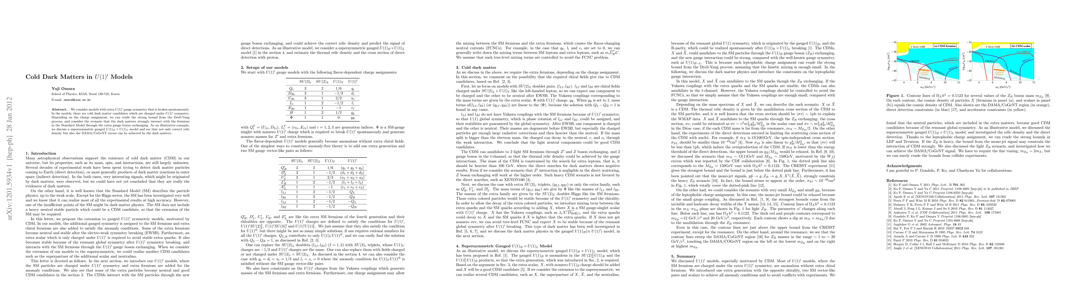 This paper explores U(1)' gauge symmetry models with spontaneous breaking, proposing cold dark matter candidates charged under U(1)'. It demonstrates how specific charge assignments can evade strong bounds and allow for strong interactions with Standard Model fermions via an extra gauge boson, using a supersymmetric U(1)_B × U(1)_L model as an example to achieve both correct relic density and the DAMA/CoGeNT excess.