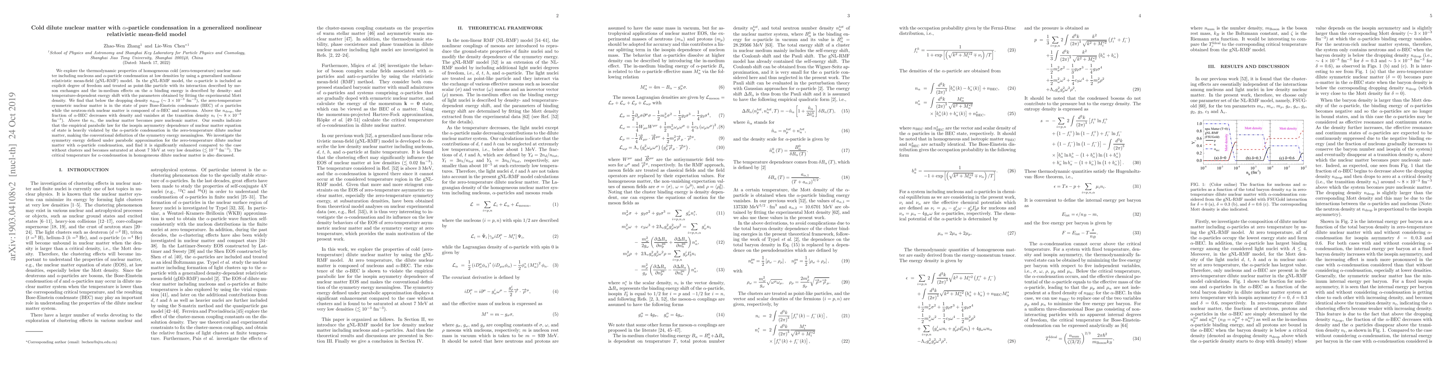 This paper investigates the thermodynamic properties of cold, dilute nuclear matter using a generalized nonlinear relativistic mean-field model, finding that below a critical density, $\alpha$-particles form a Bose-Einstein condensate, altering the conventional understanding of nuclear symmetry energy. The study reveals that $\alpha$-particle condensation significantly enhances symmetry energy, which becomes saturated at low densities.