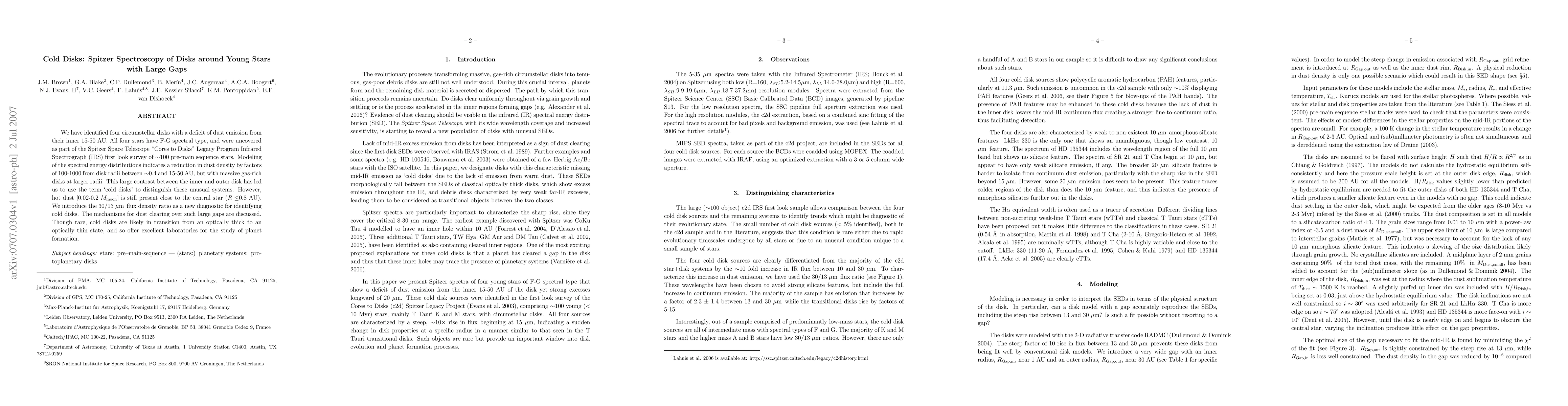 We have identified four circumstellar disks with a deficit of dust emission from their inner 15-50 AU. All four stars have F-G spectral type, and were uncovered as part of the Spitzer Space Telescope ``Cores to Disks'' Legacy Program Infrared Spectrograph (IRS) first look survey of ~100 pre-main sequence stars. Modeling of the spectral energy distributions indicates a reduction in dust density by factors of 100-1000 from disk radii between ~0.4 and 15-50 AU, but with massive gas-rich disks at larger radii. This large contrast between the inner and outer disk has led us to use the term `cold disks' to distinguish these unusual systems. However, hot dust [0.02-0.2 Mmoon] is still present close to the central star (R ~0.8 AU). We introduce the 30/13 micron, flux density ratio as a new diagnostic for identifying cold disks. The mechanisms for dust clearing over such large gaps are discussed. Though rare, cold disks are likely in transition from an optically thick to an optically thin state, and so offer excellent laboratories for the study of planet formation.