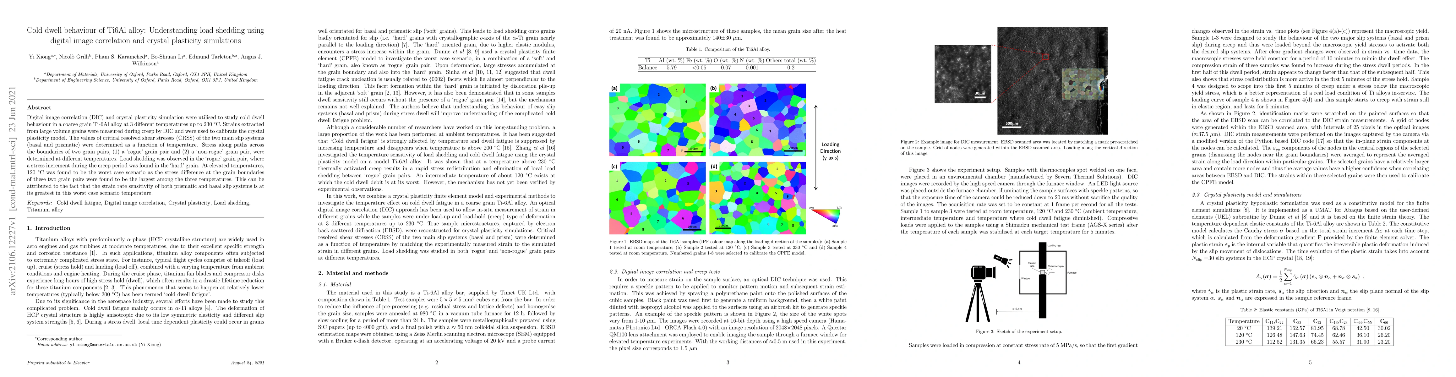 Digital image correlation (DIC) and crystal plasticity simulation were utilised to study cold dwell behaviour in a coarse grain Ti-6Al alloy at 3 different temperatures up to 230 C. Strains extracted from large volume grains were measured during creep by DIC and were used to calibrate the crystal plasticity model. The values of critical resolved shear stresses (CRSS) of the two main slip systems (basal and prismatic) were determined as a function of temperature. Stress along paths across the boundaries of two grain pairs, (1) a `rogue' grain pair and (2) a `non-rogue' grain pair, were determined at different temperatures. Load shedding was observed in the `rogue' grain pair, where a stress increment during the creep period was found in the `hard' grain. At elevated temperatures, 120 C was found to be the worst-case scenario as the stress difference at the grain boundaries of these two grain pairs were found to be the largest among the three temperatures. This can be attributed to the fact that the strain rate sensitivity of both prismatic and basal slip systems is at its greatest in this worst-case scenario temperature.