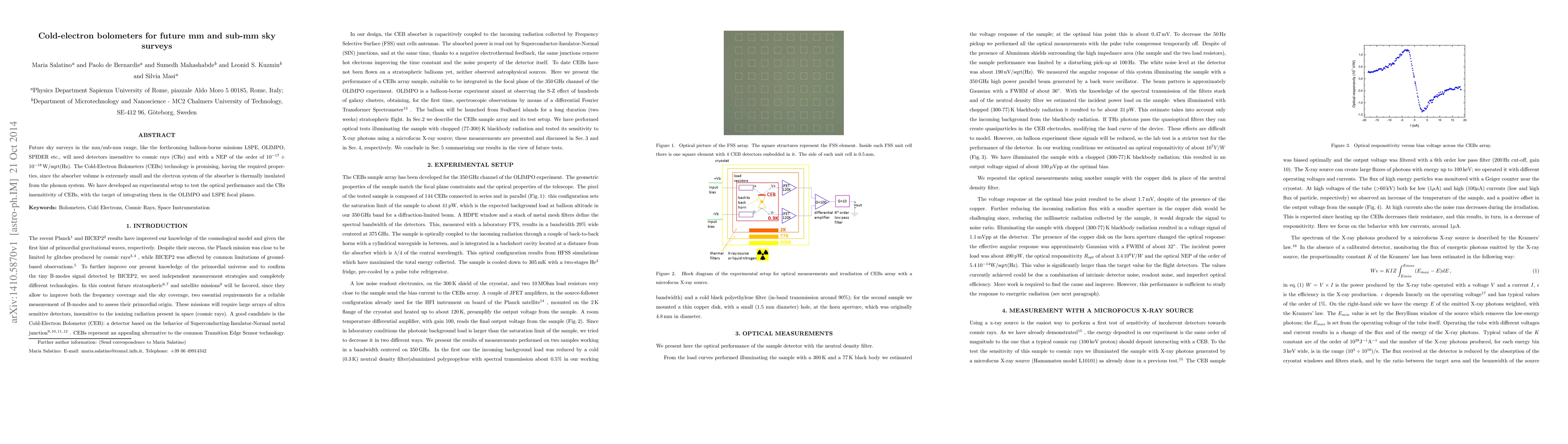 Future sky surveys in the mm/sub-mm range, like the forthcoming balloon-borne missions LSPE, OLIMPO, SPIDER etc., will need detectors insensitive to cosmic rays (CRs) and with a NEP of the order of $10^{-17} \div 10^{-18}\,$W/sqrt(Hz). The Cold-Electron Bolometers (CEBs) technology is promising, having the required properties, since the absorber volume is extremely small and the electron system of the absorber is thermally insulated from the phonon system. We have developed an experimental setup to test the optical performance and the CRs insensitivity of CEBs, with the target of integrating them in the OLIMPO and LSPE focal planes.