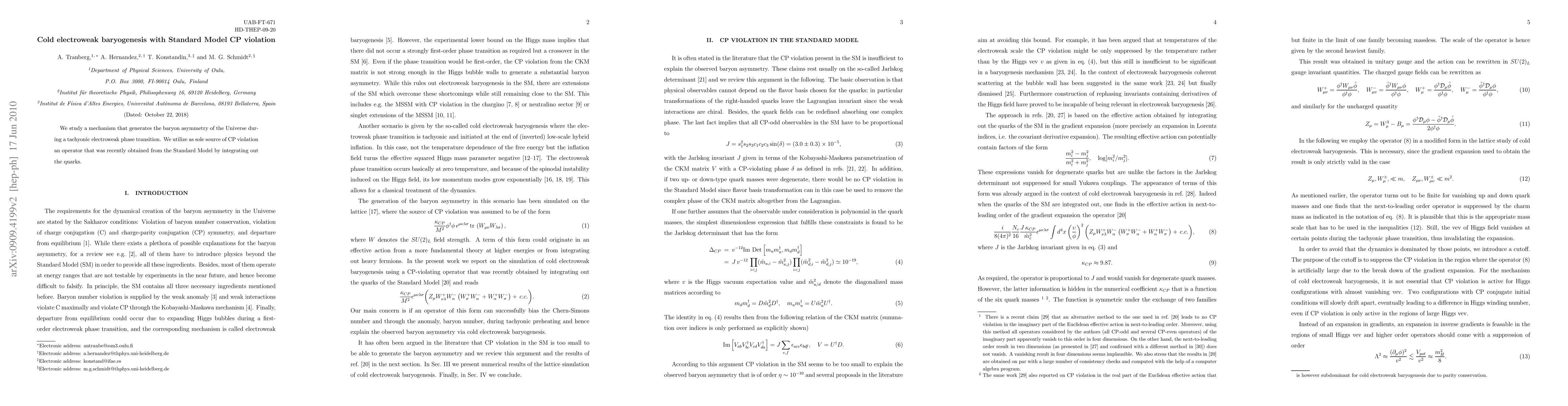 Summary: This paper explores a mechanism for generating the Universe's baryon asymmetry via a tachyonic electroweak phase transition, relying solely on CP violation from a Standard Model operator derived by integrating out quarks. The study focuses on cold electroweak baryogenesis.