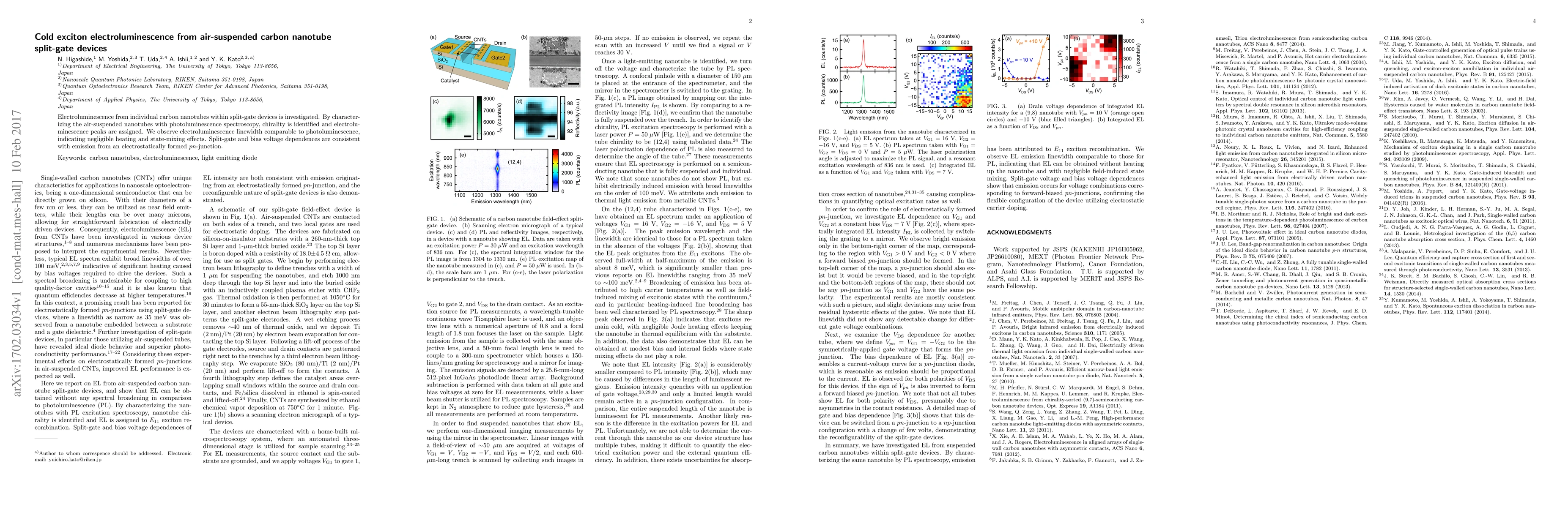 Summary: This study investigates electroluminescence in air-suspended carbon nanotubes within split-gate devices, showing that the linewidth is similar to photoluminescence, suggesting minimal heating and state-mixing, and confirming emission from an electrostatically formed $pn$-junction.