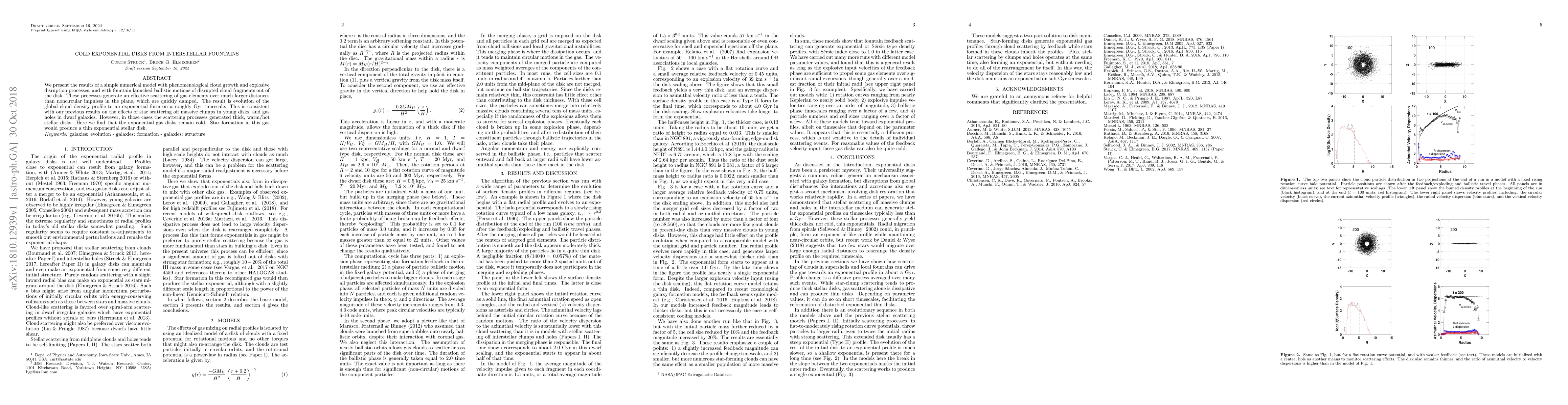 We present the results of a simple numerical model with phenomenological cloud growth and explosive disruption processes, and with fountain launched ballistic motions of disrupted cloud fragments out of the disk. These processes generate an effective scattering of gas elements over much larger distances than noncircular impulses in the plane, which are quickly damped. The result is evolution of the global cloud density profile to an exponential form on a roughly Gyr timescale. This is consistent with our previous results on the effects of star scattering o? massive clumps in young disks, and gas holes in dwarf galaxies. However, in those cases the scattering processes generated thick, warm/hot stellar disks. Here we find that the exponential gas disks remain cold. Star formation in this gas would produce a thin exponential stellar disk.