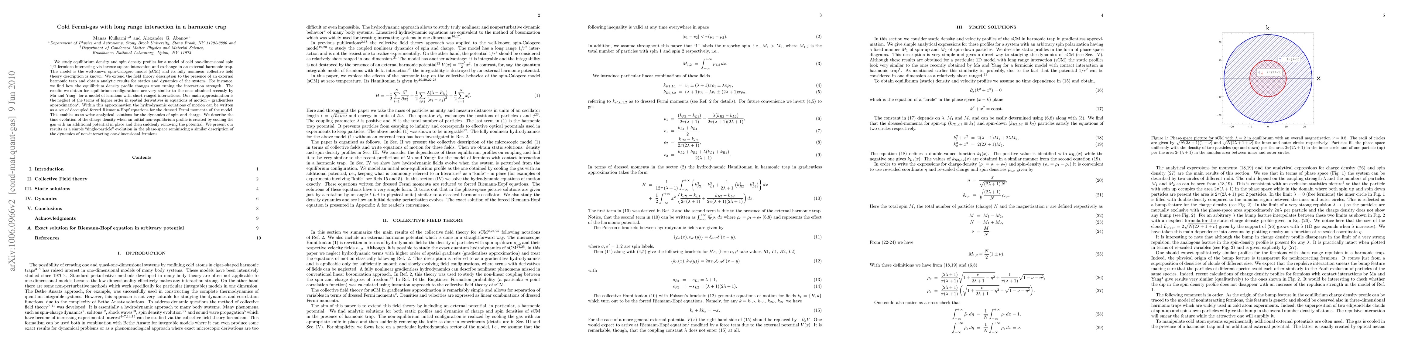 This research derives analytic results for the equilibrium density and spin density profiles of one-dimensional cold fermions with long-range interactions in a harmonic trap, using a gradientless approximation. The method simplifies hydrodynamic equations into decoupled Riemann-Hopf equations, enabling analytical solutions for spin and charge dynamics. The findings resemble non-interacting fermion dynamics, describing the system's time evolution from a non-equilibrium profile after removing an additional cooling potential.
