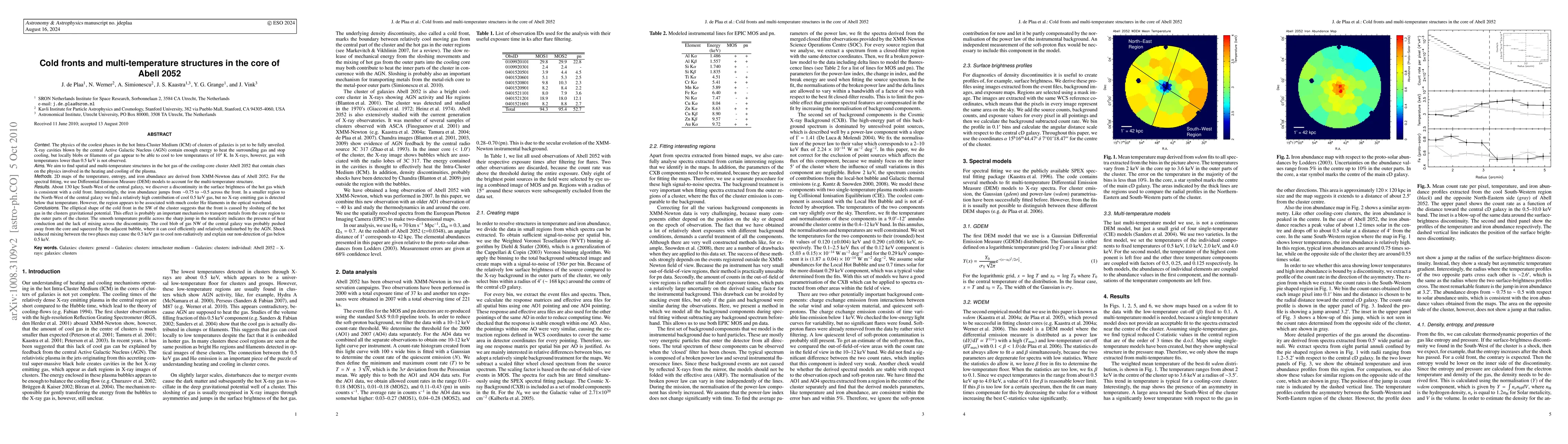 The physics of the coolest phases in the hot Intra-Cluster Medium (ICM) of clusters of galaxies is yet to be fully unveiled. X-ray cavities blown by the central Active Galactic Nucleus (AGN) contain enough energy to heat the surrounding gas and stop cooling, but locally blobs or filaments of gas appear to be able to cool to low temperatures of 10^4 K. In X-rays, however, gas with temperatures lower than 0.5 keV is not observed. Using a deep XMM-Newton observation of the cluster of galaxies Abell 2052, we derive 2D maps of the temperature, entropy, and iron abundance in the core region. About 130 kpc South-West of the central galaxy, we discover a discontinuity in the surface brightness of the hot gas which is consistent with a cold front. Interestingly, the iron abundance jumps from ~0.75 to ~0.5 across the front. In a smaller region to the North-West of the central galaxy we find a relatively high contribution of cool 0.5 keV gas, but no X-ray emitting gas is detected below that temperature. However, the region appears to be associated with much cooler H-alpha filaments in the optical waveband. The elliptical shape of the cold front in the SW of the cluster suggests that the front is caused by sloshing of the hot gas in the clusters gravitational potential. This effect is probably an important mechanism to transport metals from the core region to the outer parts of the cluster. The smooth temperature profile across the sharp jump in the metalicity indicates the presence of heat conduction and the lack of mixing across the discontinuity. The cool blob of gas NW of the central galaxy was probably pushed away from the core and squeezed by the adjacent bubble, where it can cool efficiently and relatively undisturbed by the AGN. Shock induced mixing between the two phases may cause the 0.5 keV gas to cool non-radiatively and explain our non-detection of gas below 0.5 keV.