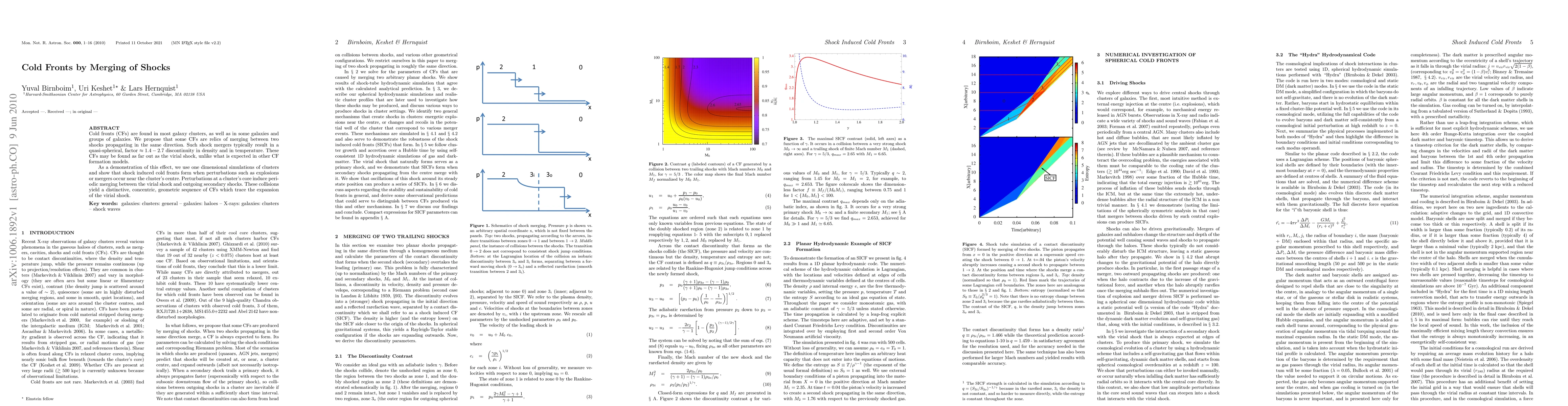 Cold fronts (CFs) are found in most galaxy clusters, as well as in some galaxies and groups of galaxies. We propose that some CFs are relics of merging between two shocks propagating in the same direction. Such shock mergers typically result in a quasi-spherical, factor ~1.4-2.7 discontinuity in density and in temperature. These CFs may be found as far out as the virial shock, unlike what is expected in other CF formation models. As a demonstration of this effect, we use one dimensional simulations of clusters and show that shock induced cold fronts form when perturbations such as explosions or mergers occur near the cluster's centre. Perturbations at a cluster's core induce periodic merging between the virial shock and outgoing secondary shocks. These collisions yield a distinctive, concentric, geometric sequence of CFs which trace the expansion of the virial shock.