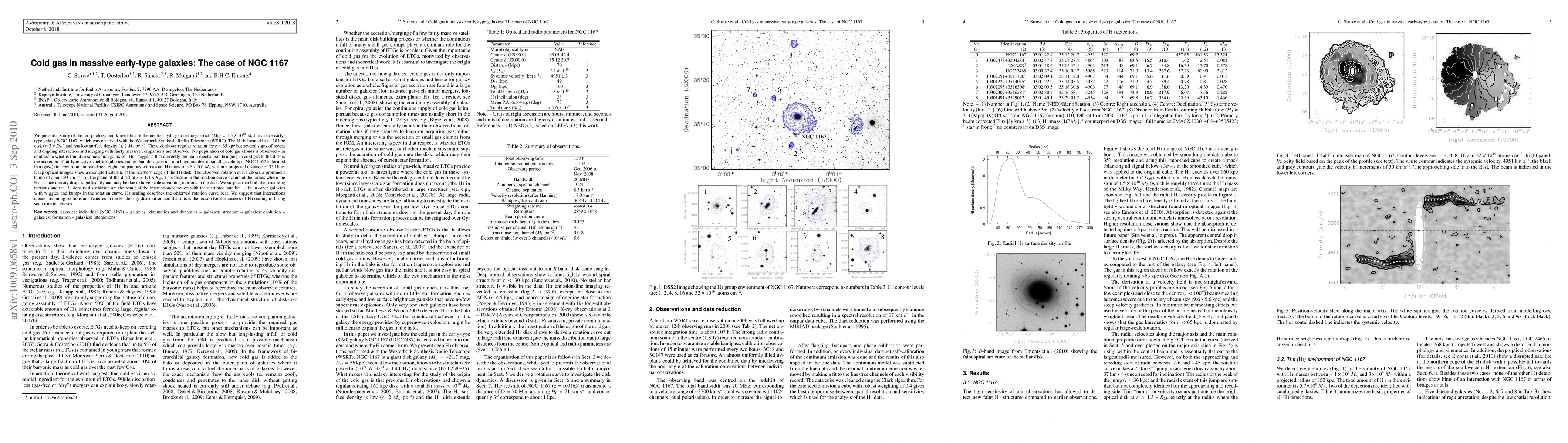 We present a study of the morphology and kinematics of the neutral hydrogen in the gas-rich (M_HI=1.5x10^{10}Msun), massive early-type galaxy NGC 1167, which was observed with the Westerbork Synthesis Radio Telescope (WSRT). The HI is located in a 160kpc disk (~3xD_25) and has low surface density (<2Msun pc^{-2}). The disk shows regular rotation for r<65kpc but several signs of recent and ongoing interaction and merging with fairly massive companions are observed. No population of cold gas clouds is observed - in contrast to what is found in some spiral galaxies. This suggests that currently the main mechanism bringing in cold gas to the disk is the accretion of fairly massive satellite galaxies, rather than the accretion of a large number of small gas clumps. NGC 1167 is located in a (gas-) rich environment: we detect eight companions with a total HI mass of ~6x10^9Msun within a projected distance of 350kpc. Deep optical images show a disrupted satellite at the northern edge of the HI disk. The observed rotation curve shows a prominent bump of about 50km/s (in the plane of the disk) at r=1.3xR_25. This feature in the rotation curve occurs at the radius where the HI surface density drops significantly and may be due to large-scale streaming motions in the disk. We suspect that both the streaming motions and the HI density distribution are the result of the interaction/accretion with the disrupted satellite. Like in other galaxies with wiggles and bumps in the rotation curve, HI scaling describes the observed rotation curve best. We suggest that interactions create streaming motions and features in the HI density distribution and that this is the reason for the success of HI scaling in fitting such rotation curves.