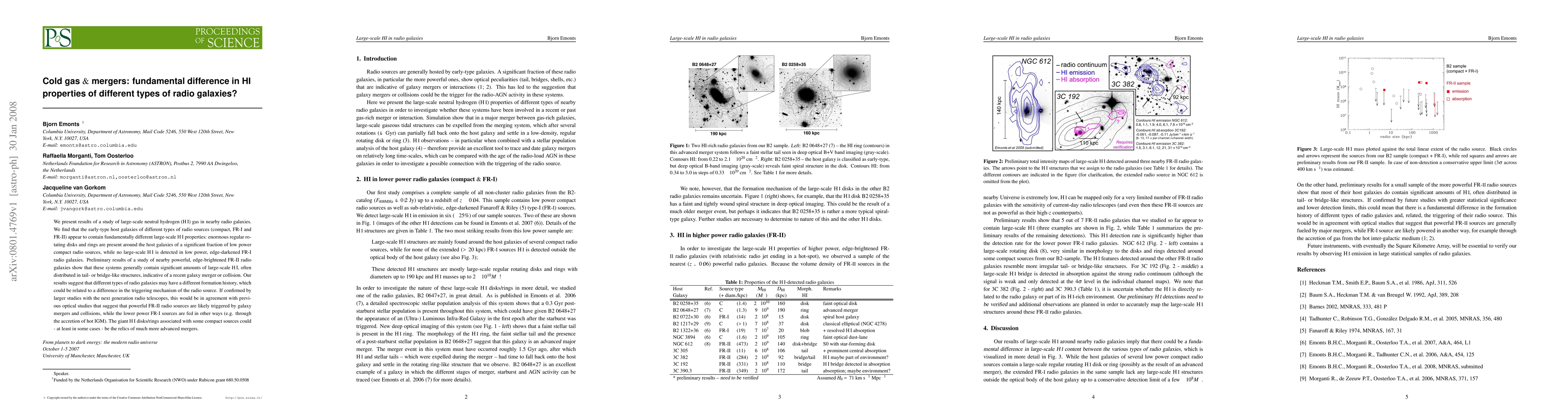 We present results of a study of large-scale neutral hydrogen (HI) gas in nearby radio galaxies. We find that the early-type host galaxies of different types of radio sources (compact, FR-I and FR-II) appear to contain fundamentally different large-scale HI properties: enormous regular rotating disks and rings are present around the host galaxies of a significant fraction of low power compact radio sources, while no large-scale HI is detected in low power, edge-darkened FR-I radio galaxies. Preliminary results of a study of nearby powerful, edge-brightened FR-II radio galaxies show that these systems generally contain significant amounts of large-scale HI, often distributed in tail- or bridge-like structures, indicative of a recent galaxy merger or collision. Our results suggest that different types of radio galaxies may have a different formation history, which could be related to a difference in the triggering mechanism of the radio source. If confirmed by larger studies with the next generation radio telescopes, this would be in agreement with previous optical studies that suggest that powerful FR-II radio sources are likely triggered by galaxy mergers and collisions, while the lower power FR-I sources are fed in other ways (e.g. through the accretion of hot IGM). The giant HI disks/rings associated with some compact sources could - at least in some cases - be the relics of much more advanced mergers.
