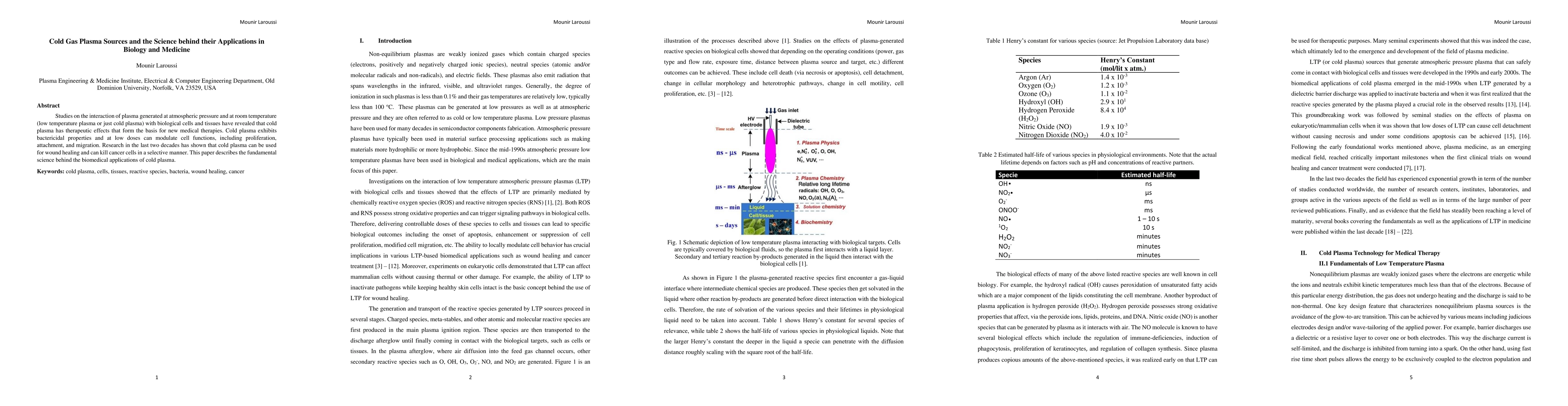 Studies on the interaction of plasma generated at atmospheric pressure and at room temperature (low temperature plasma or just cold plasma) with biological cells and tissues have revealed that cold plasma has therapeutic effects that form the basis for new medical therapies. Cold plasma exhibits bactericidal properties and at low doses can modulate cell functions, including proliferation, attachment, and migration. Research in the last two decades has shown that cold plasma can be used for wound healing and can kill cancer cells in a selective manner. This paper describes the fundamental science behind the biomedical applications of cold plasma.