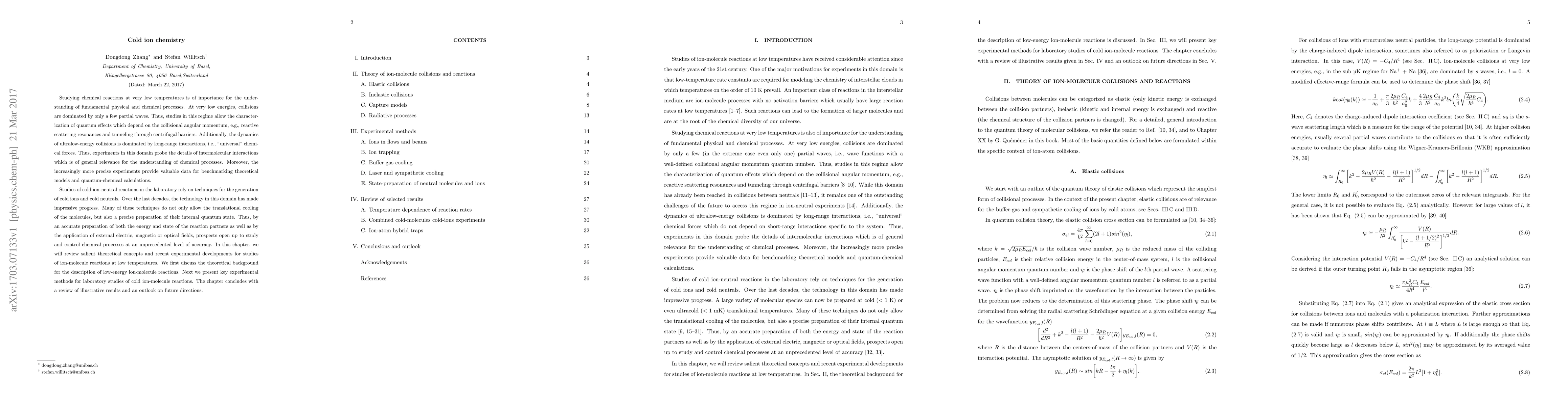 Studying chemical reactions at very low temperatures is of importance for the understanding of fundamental physical and chemical processes. At very low energies, collisions are dominated by only a few partial waves. Thus, studies in this regime allow the characterisation of quantum effects which depend on the collisional angular momentum, e.g., reactive scattering resonances and tunneling through centrifugal barriers. Additionally, the dynamics of ultralow-energy collisions is dominated by long-range interactions, i.e., "universal" chemical forces. Thus, experiments in this domain probe the details of intermolecular interactions which is of general relevance for the understanding of chemical processes. Moreover, the increasingly more precise experiments provide valuable data for benchmarking theoretical models and quantum-chemical calculations. Studies of cold ion-neutral reactions in the laboratory rely on techniques for the generation of cold ions and cold neutrals. Many of these techniques do not only allow the translational cooling of the molecules, but also a precise reparation of their internal quantum state. Thus, by an accurate preparation of both the energy and state of the reaction partners as well as by the application of external electric, magnetic or optical fields, prospects open up to study and control chemical processes at an unprecedented level of accuracy. In this chapter, we will review salient theoretical concepts and recent experimental developments for studies of ion-molecule reactions at low temperatures. We first discuss the theoretical background for the description of low-energy ion-molecule reactions. Next we present key experimental methods for laboratory studies of cold ion-molecule reactions. The chapter concludes with a review of illustrative results and an outlook on future directions.